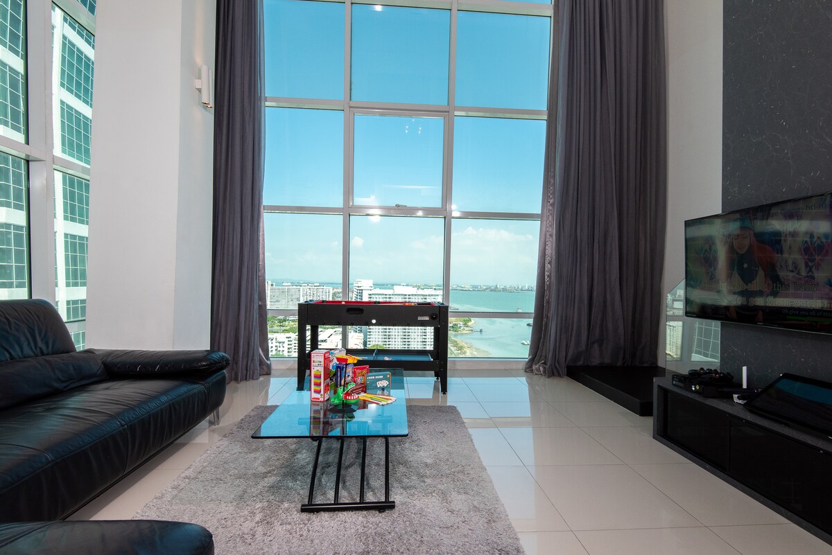 *Najbolja LOKACIJA u Penangu, VOŽNJA KOLICIMA, turistička destinacija br. 1 *DUPLEKS UGLOVA jedinica *Neverovatan pogled na more i izlazak sunca sa visokog sprata *JAPANSKI dizajnerski smeštaj sa svim sadržajima *SMART TV * WIFI od 100 Mbps *Uživajte u izvanrednom izlasku sunca iz SPAVAĆIH SOBA, dnevnog boravka i trpezarije *Okruženo HOTELIMA, TRŽNIM CENTRIMA i raznim LOKALNIM restoranima *Besplatan 1 ZATVORENI parking *Sadržaji uključuju UNUTRAŠNJI bazen, teretanu i Sky Lounge *Opuštajuće šetnje UZ OBALU