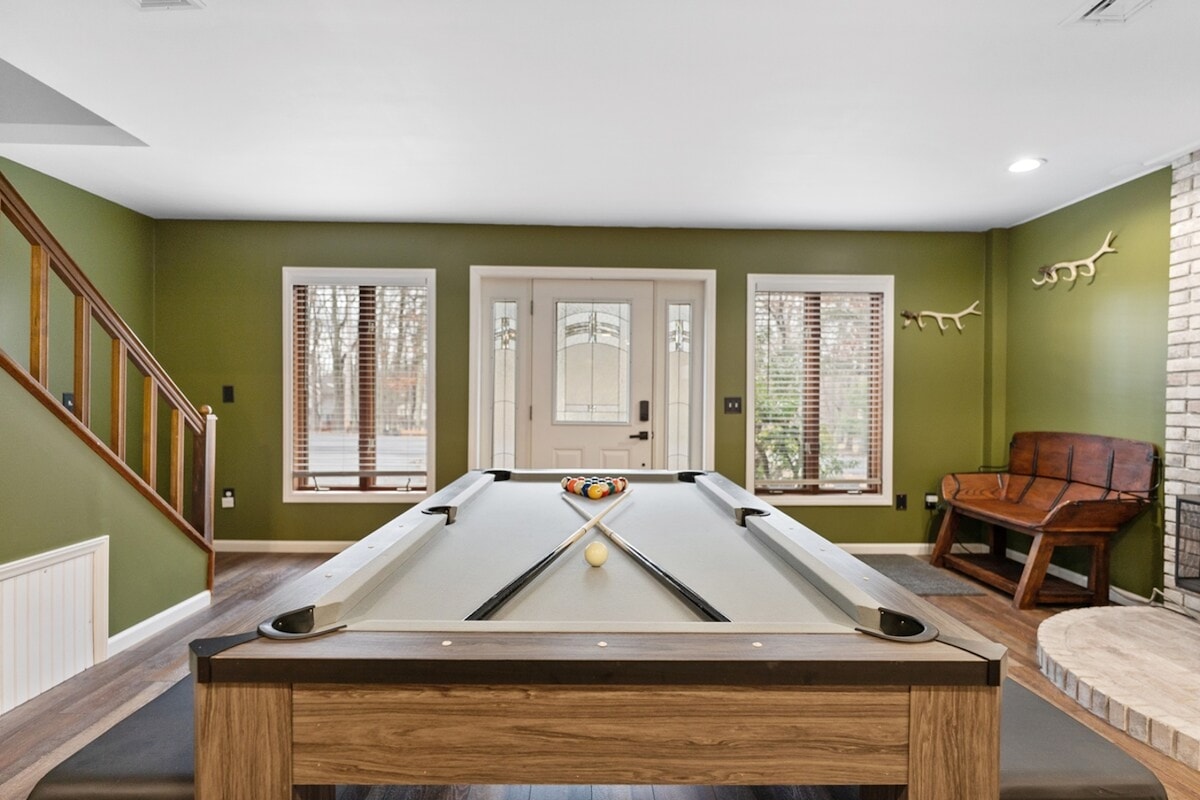 Ovaj smještaj je zaista ZAPANJUJUĆI! Oduzeće vam dah kada uđete! Tri nivoa, dva dnevna boravka, mnoštvo sadržaja (uključujući bilijarski sto, sto za poker, privatnu hidromasažnu kadu i još mnogo toga!) i prelijep, moderan dizajn. Blizak pristup mnogim planinarskim i drugim prirodnim atrakcijama! 15 min - vodeni jaz u Delaveru, centar Stroudsburga 20 min - odmaralište Kalahari, planina Šoni, Državni park Big Pocono 30 min - Bushkill Falls Doživite Poconos sa nama i saznajte više u nastavku!