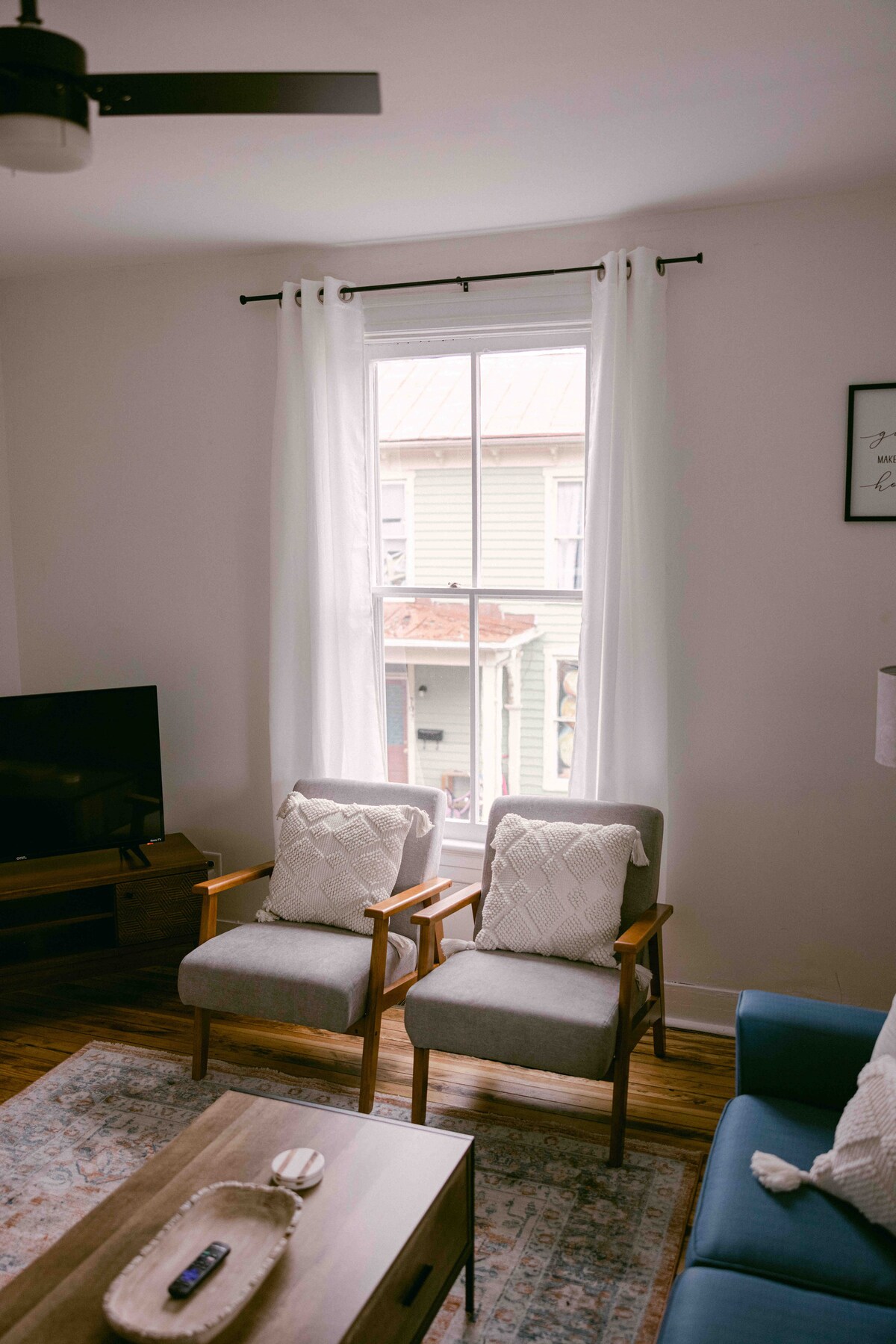 You’ll love staying in this bright open airy loft with mid-century modern decor in the heart of Downtown Lynchburg, Va. This loft is huge, but is currently only set up for two guests. There is a separate bedroom with a king size bed, closet, and sitting area As this loft is above a few other lofts, we ask that guests do not have extra people over, as it bothers the tenants and guests underneath this loft, and that they remove shoes in the loft Accessible only by one set of stairs
