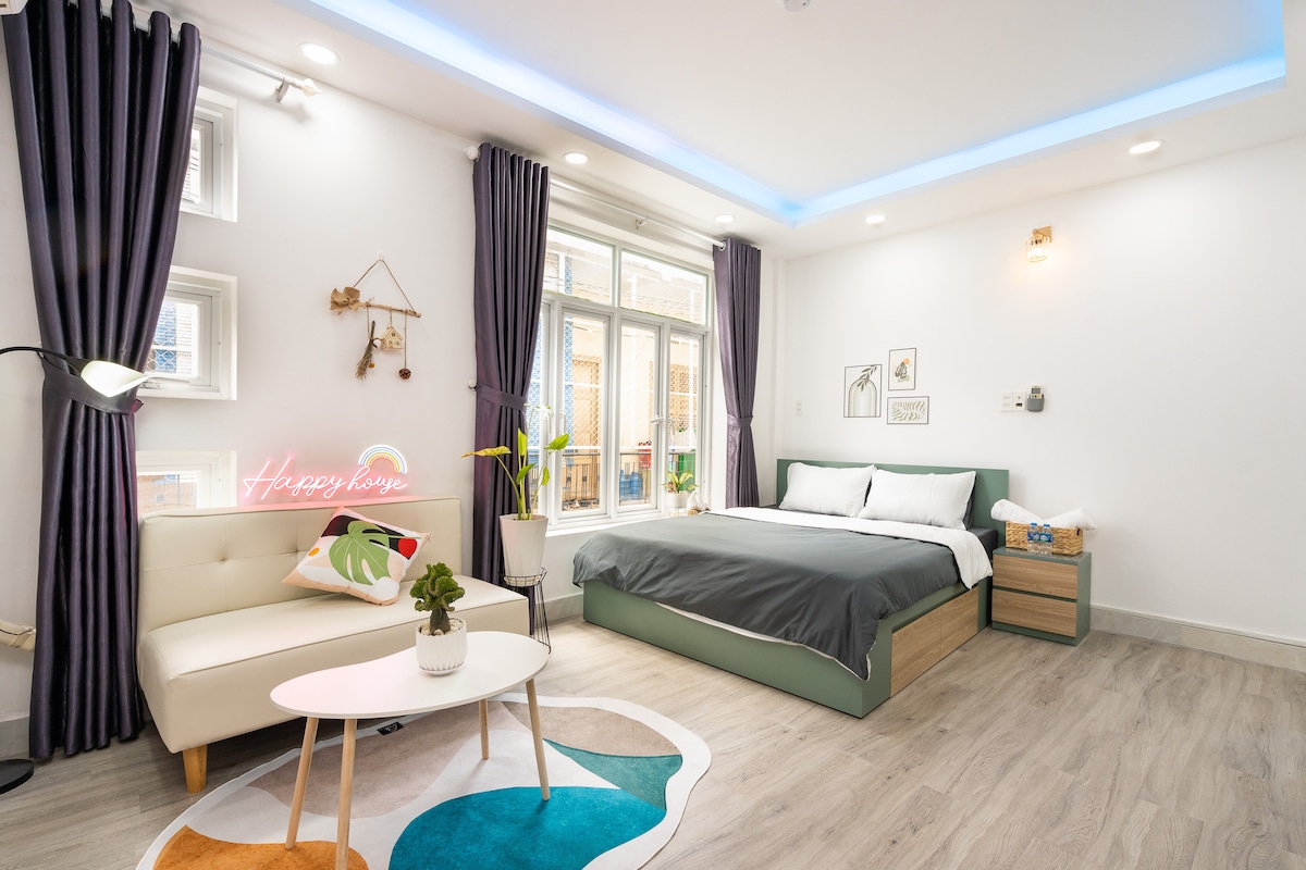 Happy House Studio is located right in the heart of Ho Chi Minh City, just 2km from District 1 center. Enjoy convenient access to famous tourist spots, dining options, and shopping areas. This spacious, cozy 1st-floor room features large windows and an airy balcony for fresh air and comfort. Fully equipped with modern amenities. Includes a separate kitchen with all cooking utensils and basic spices. Free on-site parking available Message anytime for questions or assistance. Thank you!