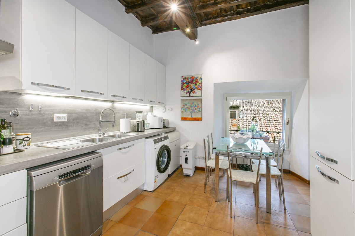 Kupajte se rimskog svetla u ovom svetlom, živahnom i šarenom stanu, sa dizajnerskim nameštajem i terasom koja se proteže kroz celu kuću za ekskluzivnu upotrebu. Svetlost je nesumnjivo element koji razlikuje ovu kuću koja se nalazi na petom spratu drevne palate i uživa u terasi duž cele kuće gde možete da doručkujete u miru i uživate u lepoj čaši italijanskog vina nakon lepog dana oko drevnih ulica „večnog grada“.