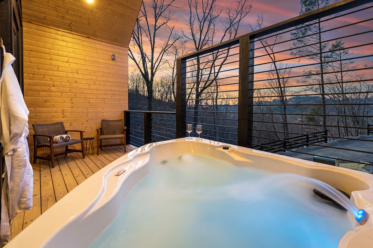 Čeka vas elegantna planinska avantura! Avalon Ridž je privatna, moderna brvnara koja oduzima dah, smještena visoko u planinama Smoki, sa nenadmašnim pogledom! Prostrana spavaća soba ima kameni kamin i luksuznu kadu za kupanje, šumovito potkrovlje je okruženo starim tvrdim drvetom, a prozori od poda do plafona prikazuju pogled s bilo kojeg mjesta u brvnari! Uživajte u izlasku sunca sa mjesta za doručak ili se opustite uz luksuzno kupanje u privatnoj hidromasažnoj kadi. Rezervišite ovaj smještaj na vrhu planine još danas!