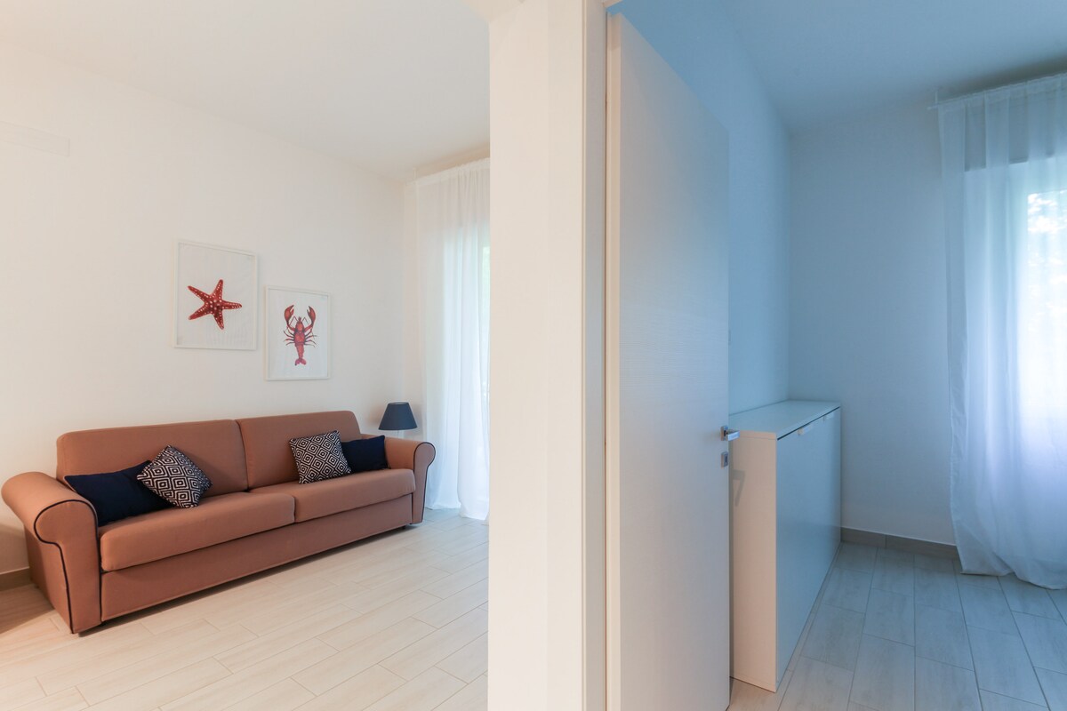 Accogliente bilocale al piano terra con giardino, ideale per famiglie e coppie. Composto da soggiorno con zona pranzo, cucina attrezzata con lavatrice e lavastoviglie, bagno con doccia e camera matrimoniale con letto a castello, con possibilità di culla. Può ospitare fino a 4 persone. Disponibile posto auto riservato. Zona centrale e comoda, con tutti i principali servizi raggiungibili a piedi.