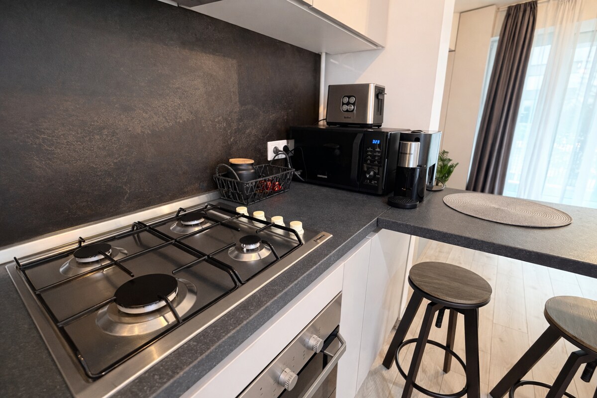 Odsjednite u lijepo uređenom jednosobnom stanu koji se nalazi u prestižnom kompleksu One North savršenom za par, poslovne putnike koji posjećuju Bukurešt. Profesionalno uređen od strane dizajnera enterijera, prostor nudi prefinjenu modernu estetiku i prijatnu atmosferu. Uživajte u udobnom bračnom krevetu, potpuno opremljenoj kuhinji, Wi-Fi mreži i namjenskom radnom prostoru savršenom za rad na daljinu. Smješteni u sigurnoj zgradi, udaljeni ste samo nekoliko minuta hoda od vrhunskih poslovnih zgrada, kafića.