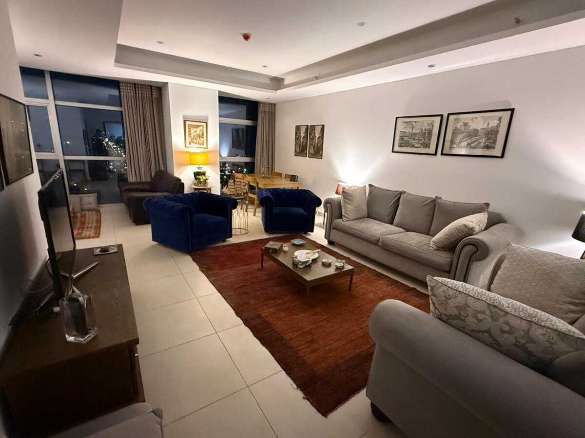 Dobro došli u @blueoakresidences Prostran apartman od 1500 kvadratnih stopa u F-11/1 Islamabadu sa 2 spavaće sobe sa kupatilom, svaka sa privatnim balkonom, toaletom, UPS rezervnim napajanjem, brzim Wi-Fi mrežom, samostalnom prijavom i 58-inčnim pametnim TV-om. Kuhinja, topla voda, besplatan parking, lift koji radi non-stop. Za grupe veće od 4, obezbeđena su 2 dodatna dušeka na podu za najviše 6 gostiju. Kolevka je dostupna na zahtev za 3+ noćenja (5000 PKR). Koraci od Loafology, Nando's, Asian Wok, KFC, Al-Fatah. Park prikladan za porodice je odmah ispred.