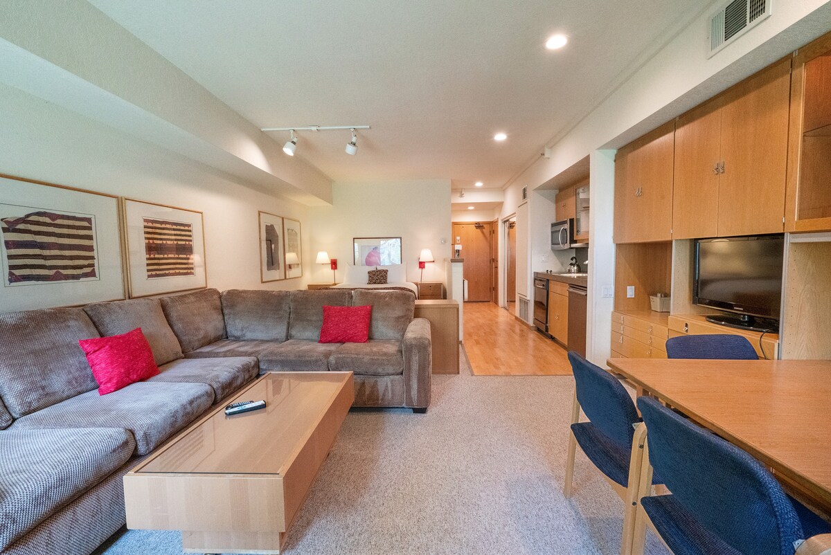 Ovaj studio apartman uz padinu u Palisades Tahoe Lodge ima pogled na skijaške staze, čajnu kuhinju, kupatilo s kadom/tušem, bračni krevet, kauč za spavanje i dvostruki krevet/sjedište pored prozora, a sve to na laganoj šetnji do svih osnovnih liftova, prodavnica, barova i restorana. PTL sadržaji uključuju natkrivenu parking garažu, 3 unutrašnje i 2 spoljne hidromasažne kade, saunu, saunu, prostoriju za vježbanje, svlačionice s tuševima i ljetnji otvoreni bazen i tenis, kao i roštilj pored bazena i na travnjaku.