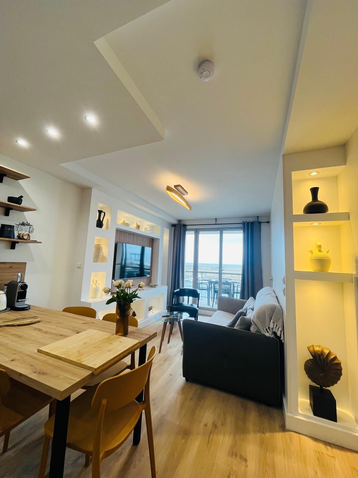 PRELIJEPA OBALA DOOVILLE OD 80 M2 JE RENOVIRANA. WI-FI VEŠ MAŠINA I MAŠINA ZA PRANJE SUDOVA . kazino, hotel ROJAL i hotel NORMANDI kao komšija. Privatni pristup rezidenciji kako biste bili vila na plaži . prelijep pogled na more i na čuvenim daskama DOVIL. LUKSUZNA REZIDENCIJA U APSOLUTNOM CALM. liftu, konsijerž . Résidence la Commanderie. Na dvorišnoj strani, u septembru 2025. godine, stakleni zidovi će biti promijenjeni. Ne smeta vam ni na koji način na morskoj strani, niti u stanu.