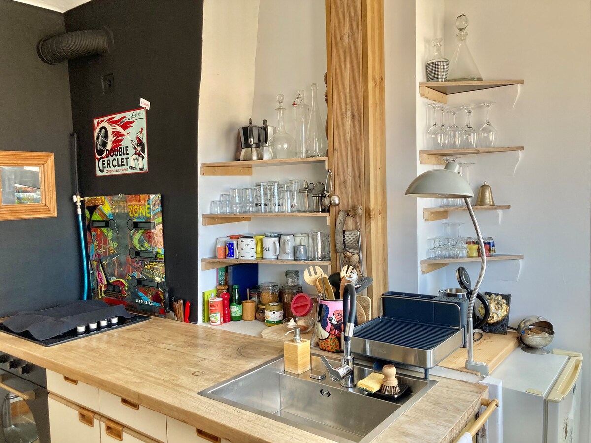 Vrlo svetao stan u srcu grada. Svideće vam se potkrovlje u velikoj dnevnoj sobi u stilu koji je i industrijski i topao. Stara luka je udaljena samo 15 minuta hoda, a metro i autobusi do plaže su udaljeni 5 minuta. Supermarket, prodavnice svih vrsta, pijaca, restorani, terase: ove sadržaje ćete pronaći u blizini dok ste u mirnoj ulici.
