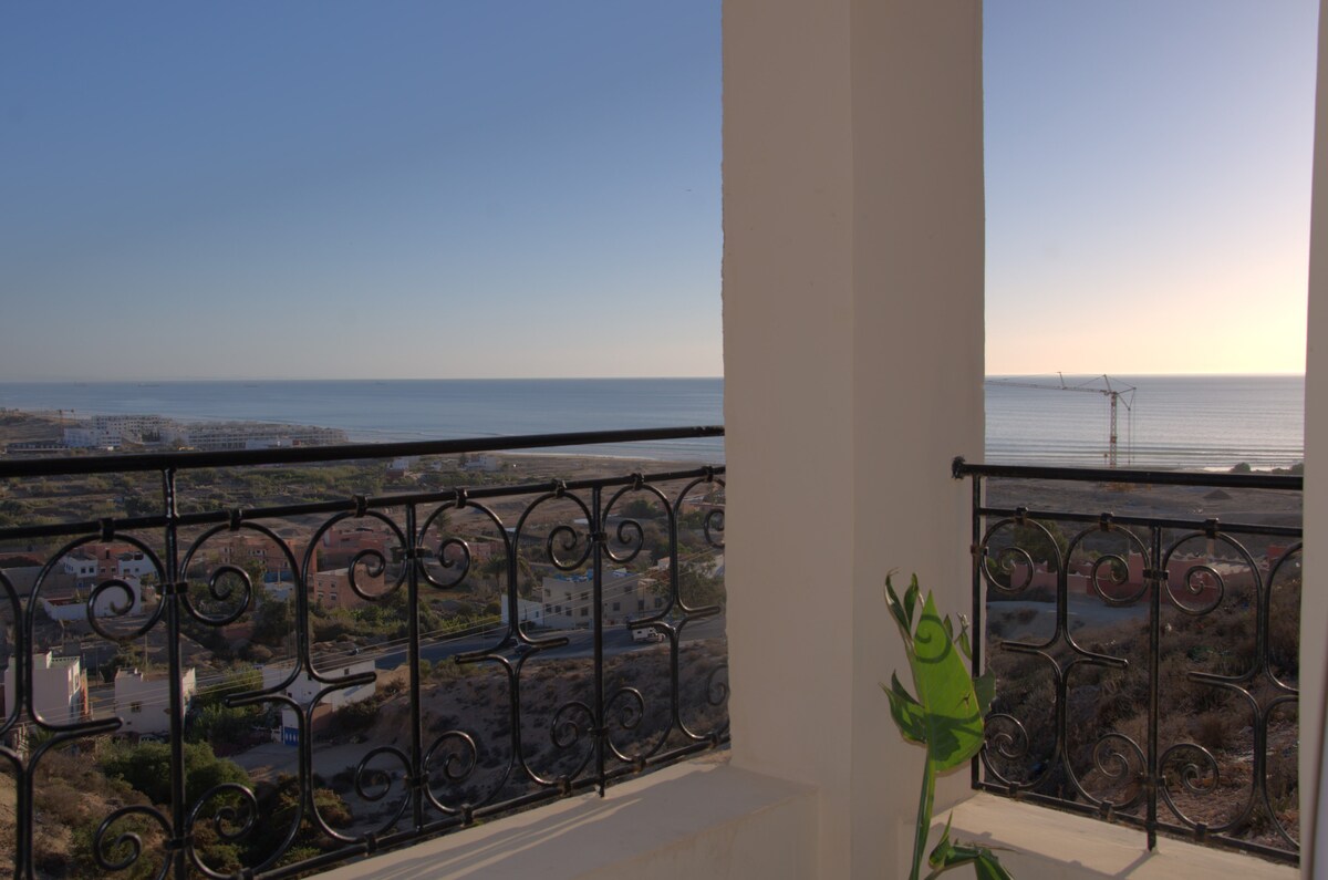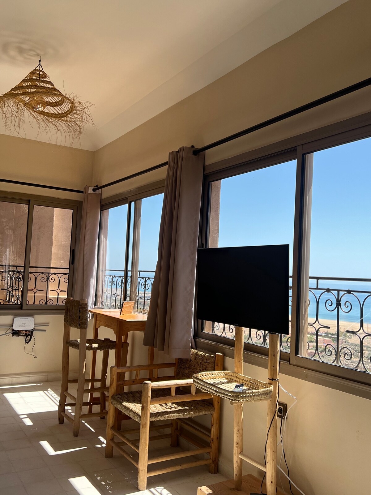 Spacious 55m² Moroccan-style apartment 15 minutes by foot to Banana Beach, featuring large windows and a balcony with ocean view. Includes a double bed, cozy salon, TV, kitchen, fridge, private bathroom with shower, Speed Wi-Fi, and coworking space ideal for remote working. Perfect for surfers, couples, or families. Breakfast included on the panoramic rooftop with stunning beach views.