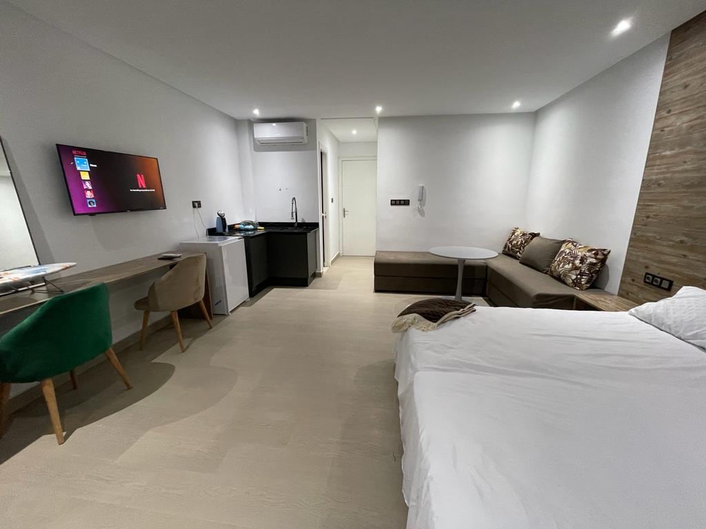 This cozy studio, located on the top floor of the building, is a rare gem in Al Hoceima. Ideally located 5 minutes from Calabonita & Matadero beaches. It offers a large private terrace with a stunning panoramic view of the Bay and Nekour Island. You'll be right in front of Almuñécar Parc in a quiet and central area. Inside, the studio features a king bed, a sofa bed, a kitchen, a bathroom, and Wi-Fi. Perfect for couples & solo travelers looking for comfort, sun, and proximity to everything