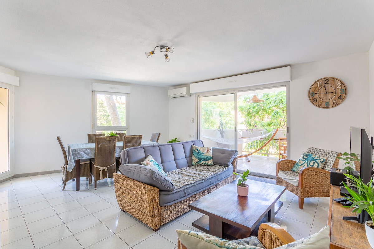 Bien placé, à 5 minutes à pieds des plages et des bons restaurants. Appartement avec climatisation réversible, 1 chambre, salon et cuisine ouverte équipée. Rénové récemment, chambre avec placard, grand miroir et lit king size (180x 200cm). Le salon comporte un canapé convertible en couchage 130cm de largeur et 220cm de longueur,une smart tv et table de repas. Parking libre dans la résidence. L’appartement est situé au 2ème et dernier étage SANS ASCENSEUR dans une résidence calme.