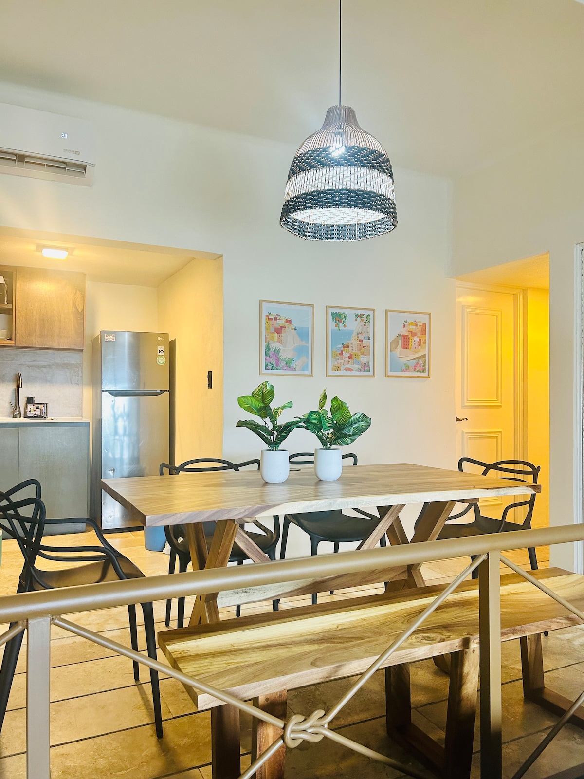 Un departamento fresco y moderno para unas vacaciones inolvidables con la familia o para trabajar en smart working. Decorado con detalles preciosos que te harán sentir como en tu propia casa. Equipado y con servicios de alta calidad: internet 200mbps, lavadora/secadora, smart tv, agua caliente y aire acondicionado. Se ubica a 2 minutos caminando de la playa Santa Cruz y cerca de restaurantes, tiendas y mercados. Además cuenta con un rooftop común desde donde se alcanza a ver el océano.