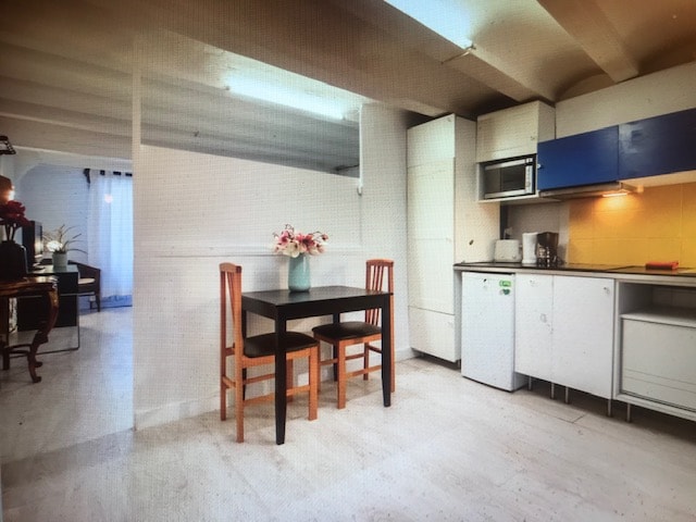 Potkrovlje je bilo ovde pre nego što smo se uselili. To je jedna od najstarijih zgrada u Poblenu. Stan je pretvoren u veliki otvoreni prostor koji uključuje kuhinju, trpezariju, kauč, TV, kancelarijski prostor i spavaću sobu. Smještaj se nalazi u prizemlju, tako da je dostupan osobama sa invaliditetom i porodica sa djetetom. Uživamo u popodnevnom suncu i jutarnjim satima. Imamo sunce koje sija na ulazu i na terasu. Držali smo mnogo industrijske opreme u prostoru, a mnogo namještaja koje smo implementirali prati ovaj industrijski dizajn. Ne treba zaboraviti da je to bio industrijski prostor do početka ove godine, a to nije konvencionalni stan. To je jedan veliki otvoreni prostor, a soba za goste je odvojena. Gosti će imati puni pristup stanu. Smještaj uključuje veliku otvorenu kuhinju, trpezariju, kauč i TV, kupatilo, spavaću sobu, terasu i dovoljno prostora. Obično smo dostupni i volimo da komuniciramo sa gostima. Međutim, postoje trenuci u kojima nismo dostupni našim gostima jer imamo svoje planove. Takođe poštujemo činjenicu da možda imate planove i da nemate vremena da komunicirate sa nama. Međutim, željeli bismo da uživamo u zajedničkom obroku, barem u branču ili večernjoj užini. Naša četvrt je živopisna, a nadolazeće područje Barselone, do plaže ima najviše 5 minuta hoda, a žuta linija metroa prelazi odmah ispred stana. Morate da zapamtite stanicu Selva de Mar. U okolini se nalaze neki mali restorani i barovi, a tu je i veliki supermarket Mercadona za kasnonoćnu kupovinu grickalica (do 21:15) ili u šoping centru (do 22:00). Ili ako treba da kupite crno vino za večeru. Ako prošetate još dva bloka do juga, naći ćete Rambla del Poblenou, to je pješačka ulica i ima brojne barove i restorane različitog kvaliteta. Rambla Poblenou je pravo od dijagonale do plaže. Ako volite da jedete tapas, možemo da preporučite restoran koji se zove La Tertulia u La Rambli del Poblenou, ili druga opcija, restoran Bitacoras u blizini Ramble. Ako volite da jedete meksičku hranu, „Los chilis” u La Rambla del Poblenou je veoma dobar izbor. Ali ako ste vegan ili vegetarijanac, ispred stana se nalazi veganski restoran, unutar fabrike/bašte (Palo Alto) koji radi od ponedjeljka do subote. Posljednja preporuka je „El Traspaso” koji se nalazi u uglu i dobra je opcija za noć:) Možete završiti noć uz dobar koktel i Bloody Mary. Žuta linija metroa ide nasuprot plaži, udaljena je 5 minuta hoda, a stanica metroa koju treba da potražite je Selva de Mar. Jedna stvar koju treba zapamtiti je da je naše poslovanje registrovano u prostoru, da smo honorarni saradnici i radimo od kuće, ali ako neko pita, vi ste jednostavno prijatelji koji nas posjećuju. Poblenou je živopisno područje u usponu, sa malim kafićima, umjetničkim studijima i pješačkom ulicom sa mnogim restoranima i barovima. Plaža je udaljena samo pet minuta hoda, a žuta linija metroa prelazi odmah ispred stana.