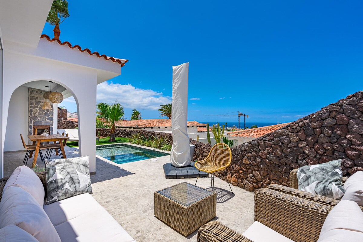 Beautiful modern house! 3 bedrooms, 3 bathrooms, one WC, very big terrace with private heated pool and gardens, magnificent views to the ocean. It is situated just in 7 min walking from the famous Siam Park and a new shopping center Siam Mall. The heating of the swimming pool is 150 euros per a week. We have outdoor camera for security. we´re responsible for ensuring that our listing is safe and compliant with safety regulations.