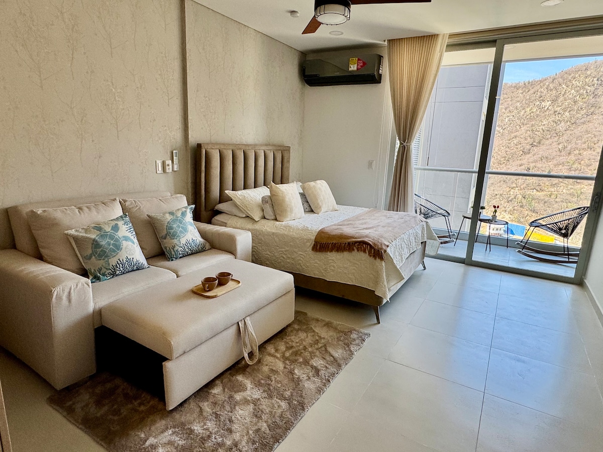 Cierre del Parque Tayrona entre el 1 y el 15 de febrero 2026. Espectacular vista a la bahía, diseño elegante y cómodo, perfecto para disfrutar de días de descanso en pareja o temporadas largas de trabajo. Cocina completa con vista a la bahía. Amplia terraza privada, aircon, wifi, fibra óptica, televisor conectado a internet. Área social con amplia piscina compartida, vista a la bahía, barbacoa y sitio de descanso. Loft no apto para niños, ni personas con limitaciones para caminar.