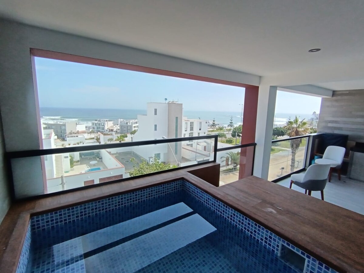 SMEŠTAJ SA PET ZVEZDICA. ORIJENTISAN NA PORODICU. Visok kvalitet. Super čista kuća. 3 sprata. 500 m2. Super udobno. Fantastična arhitektura. Neverovatan pogled na sve strane. Kuća u gradu ispred okeana + zabava gledanja talasa za surfovanje. Prilično dobar kraj. Bolje vreme nego u Limi. 100 metara južno od Penjaskala. Plaža Santa Rosa, u Limi, najsličnija plažama severnog Perua. Grubi beli pesak!