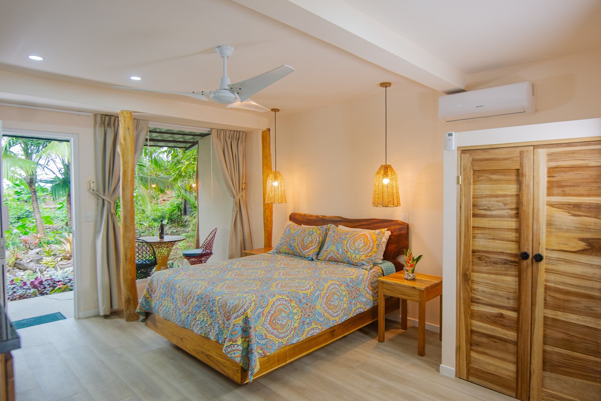 Tucked into lush tropical gardens, this private lower-level suite feels like your own little Garden of Eden. Relax in your hammock as the jungle comes alive around you—toucan calls, rustling palms, and the slow rhythm of nature. The open-air outdoor shower is a guest favorite, offering a truly immersive jungle experience. Just minutes from the beach, restaurants, and everything Puerto Viejo has to offer.