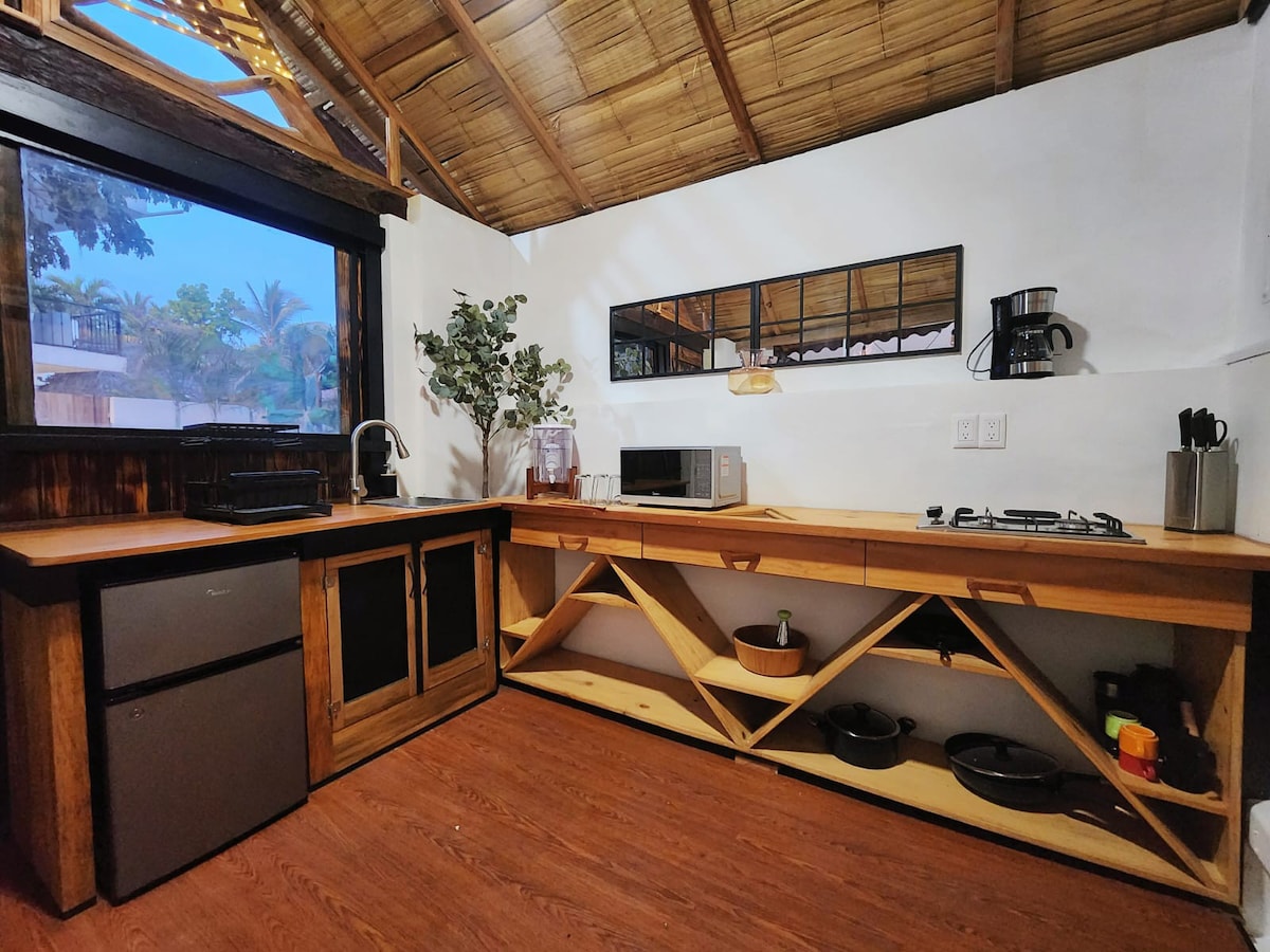 Kazita br. 5 je vaš potpuno privatni stan od 600 kvadratnih metara na našem imanju na plaži. Idealne za parove ili samce, kasite pružaju potpunu privatnost u otvorenosti rasporeda garsonjera. Prednja strana kasita otvara se ka unutrašnjem dvorištu kroz ogroman par francuskih vrata širokih 6 metara kroz koja se pruža pogled na okean i povjetarac pravo u vašu casitu. Možete da skuvate obrok u kuhinji, a zatim da večerate u unutrašnjem dvorištu. Pogled iz ove kasite se pruža iz unutrašnjeg dvorišta.
