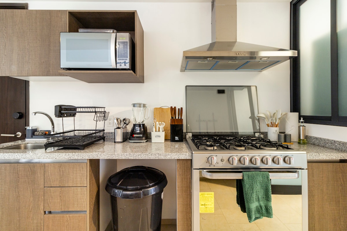 ZGRADA „LA DROP” između Plaza del Parque i Plaza Boulevares Privatna terasa, sa stolom i 8 stolica Brzi Wi-Fi SmartTV (Roku) u dnevnoj sobi i glavnoj spavaćoj sobi Udoban radni sto sa kontaktima i USB priključkom u slučaju da treba da radite Kuhinja sa šporetom, mikrotalasnom rernom, frižiderom, blenderom, aparatom za kafu, posuđem, posuđem i prečišćivačem vode u 5 faza Mašina za pranje i sušenje veša Ulaz sa digitalnim tablicama, ulazite i izađite kada vam zatreba Nije pogodno za kućne ljubimce