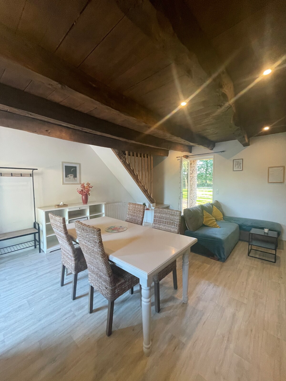 Skriveni dragulj u srcu ruralne Bretanje nalazi se u seoskoj stazi. Zakoračite u otvorenu kuhinju/salon koji ima borov sto i 4 stolice. U salonu se nalazi stočić za kafu, dve elegantne braon kožne sofe i pametni TV pričvršćen za zid sa Netflix-om. U sobi za sunčanje nalazi se ringla sa dve stolice. WC/mašina za pranje veša u prizemlju je u pomoćnom prostoru. Na spratu se nalaze 2 velike spavaće sobe koje imaju bračne krevete (širine 180-220 cm) i duboke dušeke sa perjem od 9 cm.