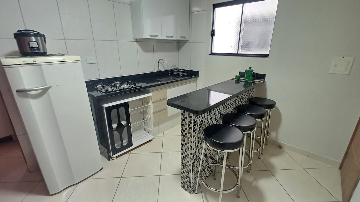 Sinta-se em casa neste apartamento cuidadosamente planejado e espaçoso, lugar para 6 hóspedes bem acomodados, suíte com cama King size, paredes com isolamento térmico, quarto com Tv Netflix, Prime, cortina blackout, no jeito pra você relaxar! Cozinha completa com churrasqueira integrada, filtro com água potável, quarto de hóspedes,sala com Tv, lavanderia com máquina de lavar, lavabo e vaga para 2 carros pequenos. Tudo a 900 metros do centro e com preço ótimo!