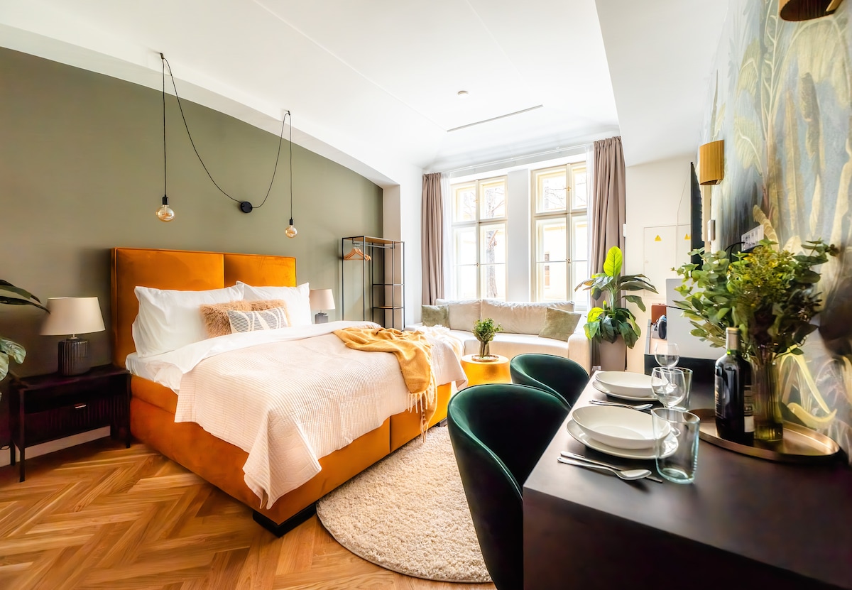 ★ Historic House ★ Original Furniture and Art ★ Kitchen ★ High-speedWiFi ★ Experience the original atmosphere of a baroque building in Prague downtown. The apartment with furniture from the 'fin de siècle'' epoch has a large bathroom, cloakroom and conservatory. Big enough for four guests, modern, equipped kitchenette, king size bed and convertible sofa. Washer/dryer, Wi-Fi, Netflix TV provided. Hope that original art and Persian rugs from family collection will make your stay pleasant.