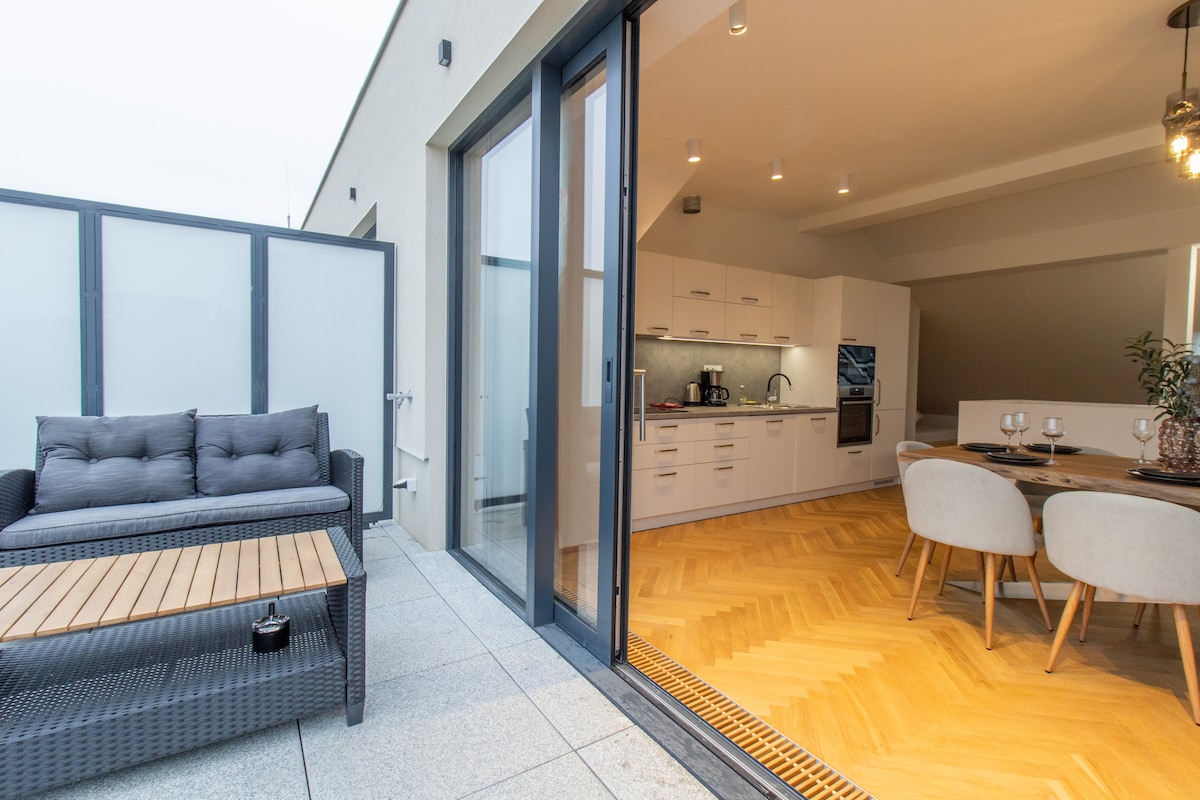 Dobro došli u naš IZUZETNI stan na krovu u samom srcu Praga! Ovo elegantno i prostrano utočište nudi 4 prekrasne spavaće sobe, koje udobno mogu da prime do 12 gostiju, što ga čini savršenim izborom za grupni ili veliki porodični odmor. Doživite ČAROLIJU Praga sa pogledom od 360° sa naše ogromne terase, gdje možete da uživate u veličanstvenoj panorami grada. Ostanite hladni i prijatni uz naš vrhunski sistem klima-uređaja. Naš ELEGANTAN i MODERAN prostor obećava NEZABORAVAN boravak.