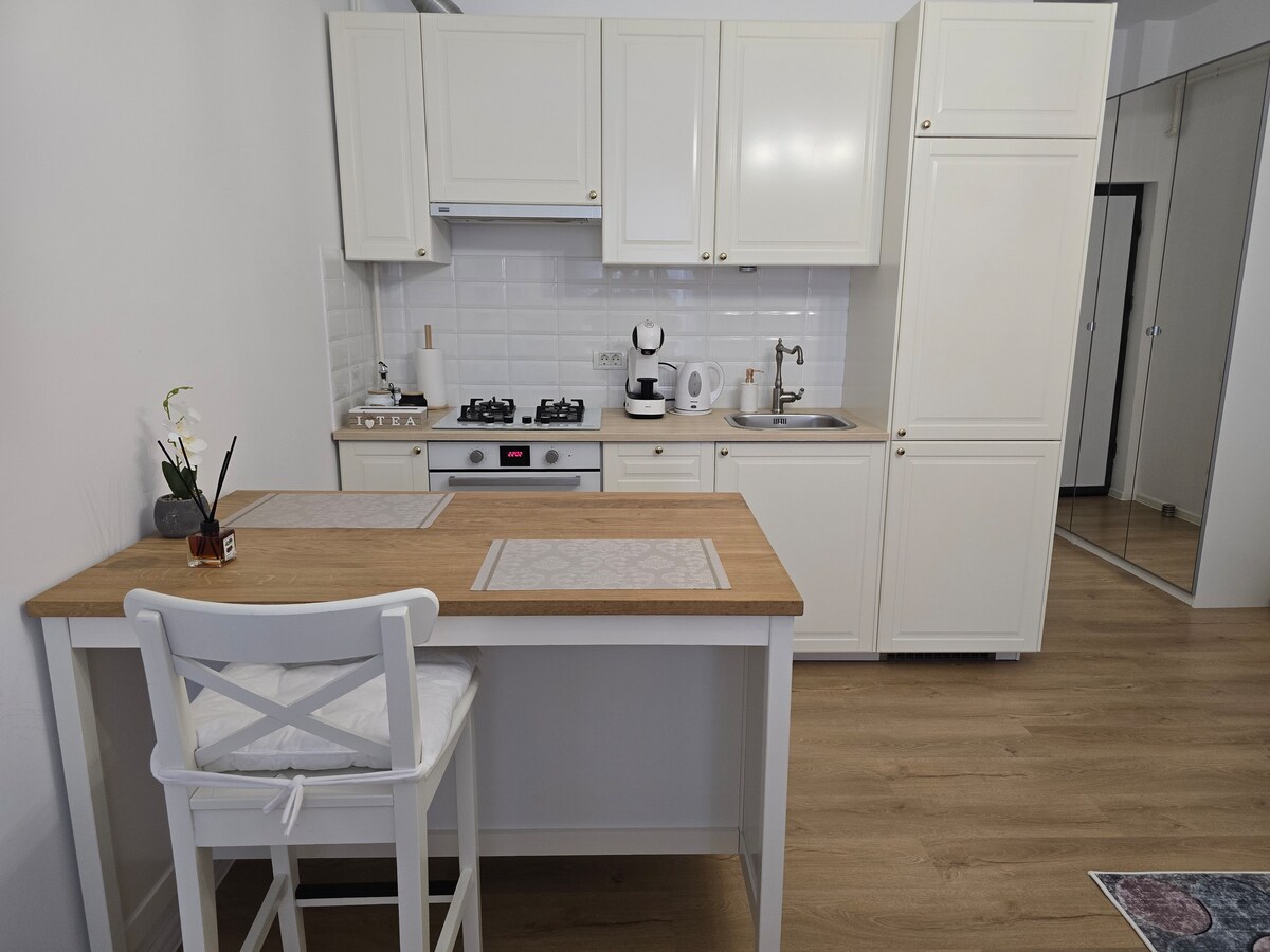 Prostrana luksuzna garsonjera od 40 kvadratnih metara u srcu Bukurešta, na samo nekoliko koraka od Starog grada Bukurešta. Nedavno renoviran, apartman ima elegantan dekor, udoban bračni krevet (180×200 cm), elegantan kauč, udoban balkon, veliku potpuno opremljenu kuhinju i prostrano kupatilo sa tušem sa efektom kiše. Domaćin je superdomaćin sa više od 7 godina iskustva. Metro je odmah pored zgrade. Kafić, poslastičarnica, mini marketi, brza hrana, bankomat i menjačnica u prizemlju.