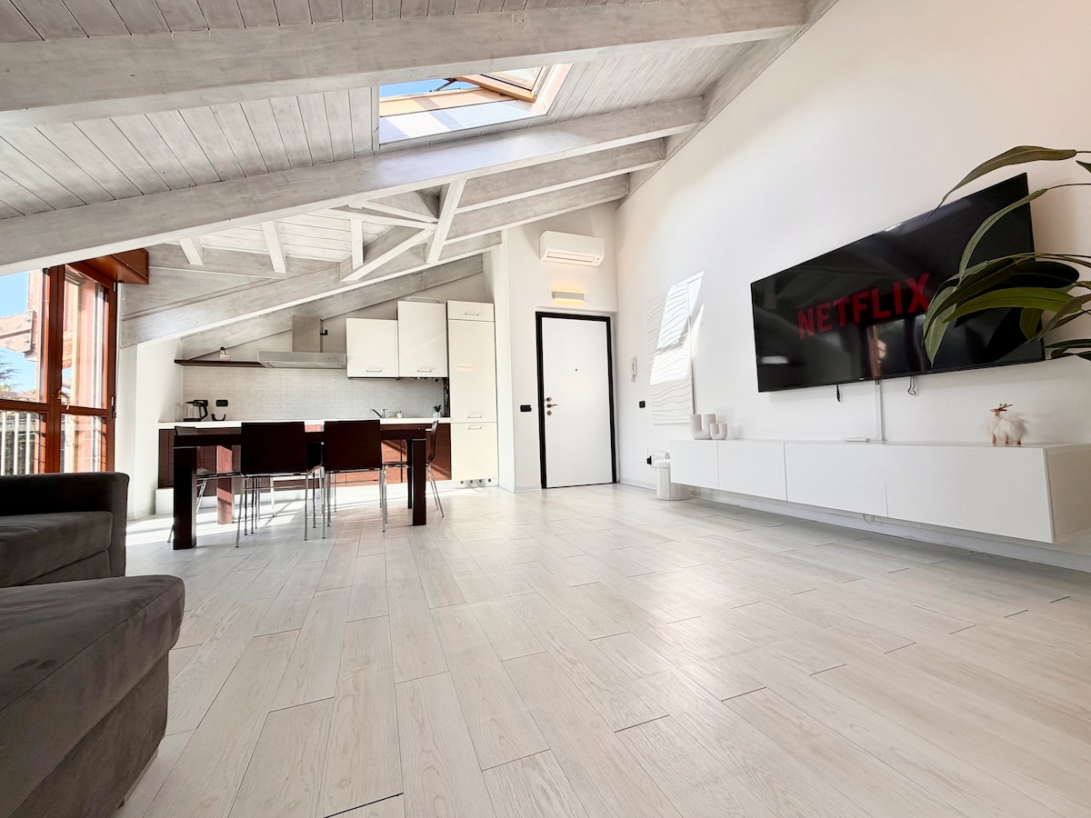 Attico super luminoso e dal design unico, con soffitto in legno e lucernario panoramico che inonda gli ambienti di luce naturale. Zona giorno open space con cucina attrezzata e area relax con Smart TV 75”Posizione strategica, in zona tranquilla e ben collegata, a pochi minuti da Rho Fiera Milano. Ideale per viaggi business o soggiorni turistici. Comfort, stile e praticità in un ambiente davvero speciale. 🅿️ Parcheggi gratuiti 🚗