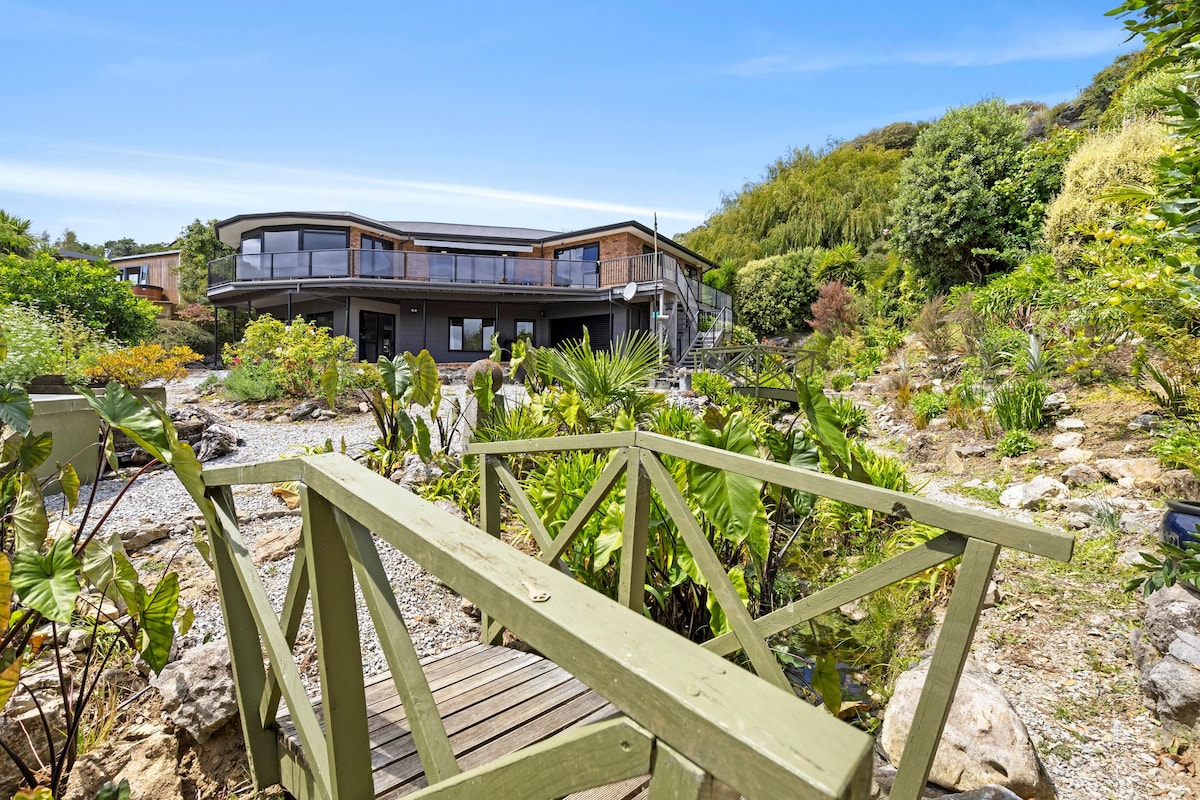 Direktno na granici NACIONALNOG PARKA ABEL TASMAN koji nudi VELIČANSTVEN POGLED na BESKRAJNO NEBO, NEPRESTANO MIJENJAJU MORSKE PEJZAŽE , ZELENU ŠUMOVITU PLANINU, a sve to u RIJETKOJ POTPUNOJ PRIVATNOSTI. Uživajte u nezaboravnim pogledima na Abel tasman, Golden Bay, Farewell Spit i šire iz udobne zemljane zgrade smještene na daljinu na visini zaliva Vainui. UDOBAN i ROMANTIČAN, to je savršen ODMOR za OPUŠTANJE za LJUBITELJE PRIRODE i ZVIJEZDE GAZERS koji žele drugačiji doživljaj.