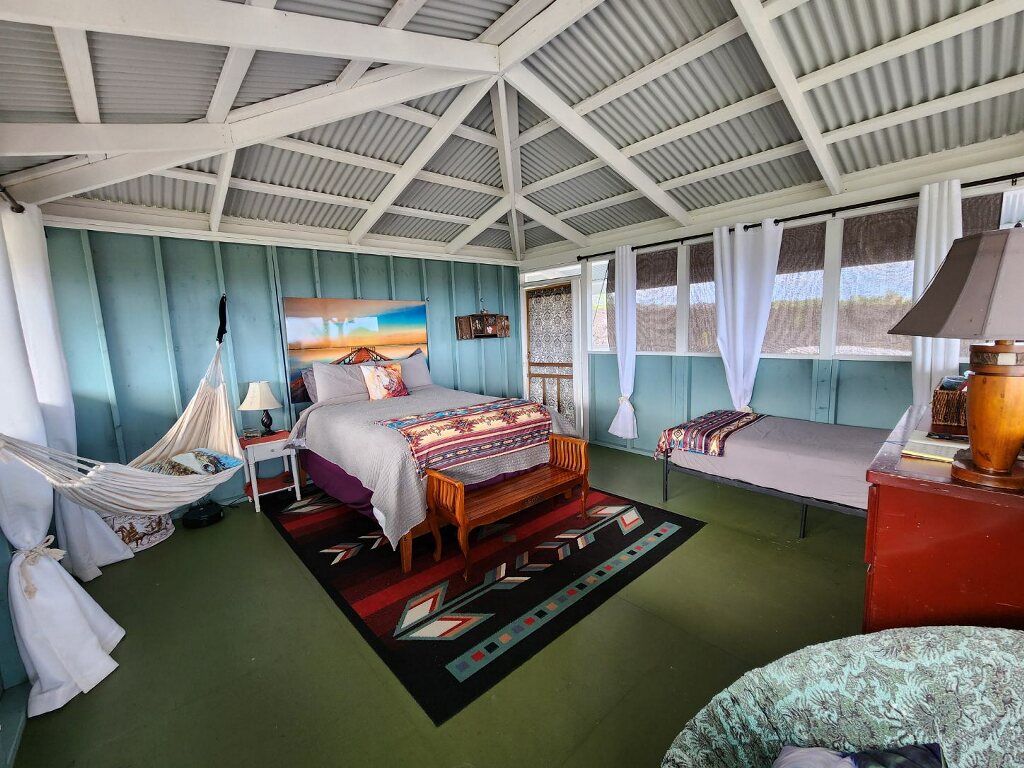 „Mir i povjetarac, prostran pogled na okean, odlična lokacija u Donjoj Puni sa konjima koji pasu u blizini... Jedinstvena! Ovaj porodični ranč je bio pokriven vulkanom Kilauea 2018. godine. Obnova je počela 2020. godine na spektakularnim novim terenima. Vaša koliba za konje je miran, bezbjedan havajski raj van mreže. Imate najbolji pogled iz svog lanaja - rijeke lave, okeanske panorame, konje i paune i beskrajne zvijezde. Smješten u blizini slikovitog parka Red Rd i nekoliko minuta do plaže Isaac Hale, srca Donje Pune.