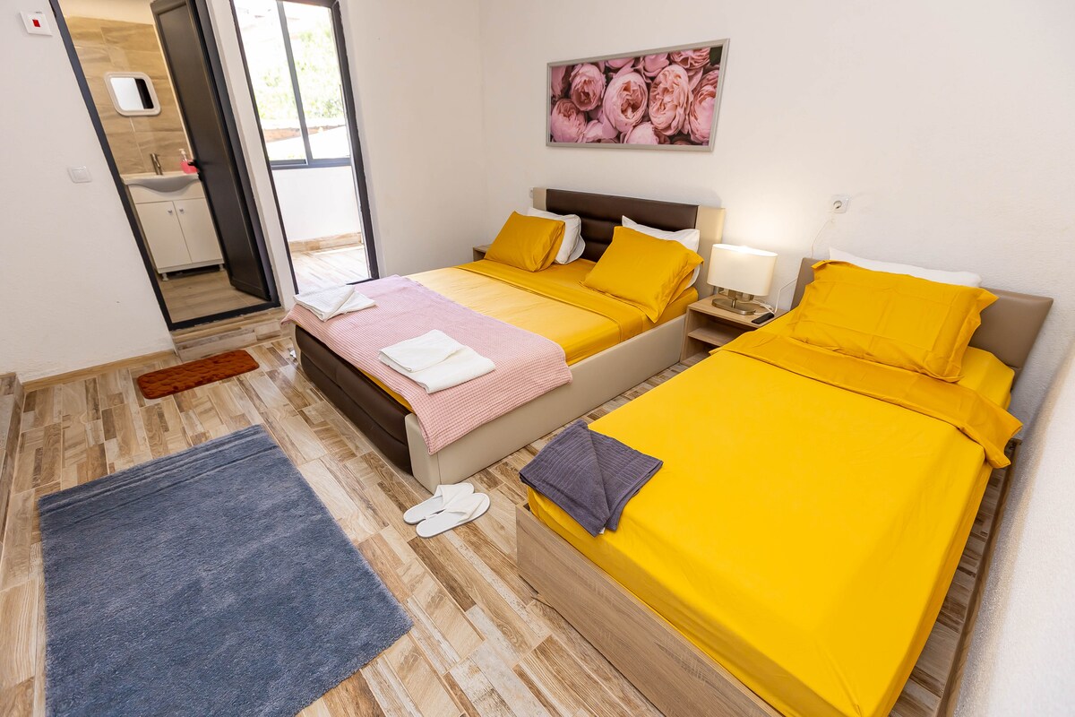 Welcome to our stylish two-bedroom apartment in the city centre of Sandanski. The apartment boasts a fully equipped kitchen and two bedrooms, bathroom and two balconies. Each room is equipped with air conditioning, ensuring your comfort. You can enjoy watching TV in the main bedroom and living room. The living room couch can extend into a bed, allowing to accomodate a fifth guest. The private parking lot and working space will make your stay even more comfortable.