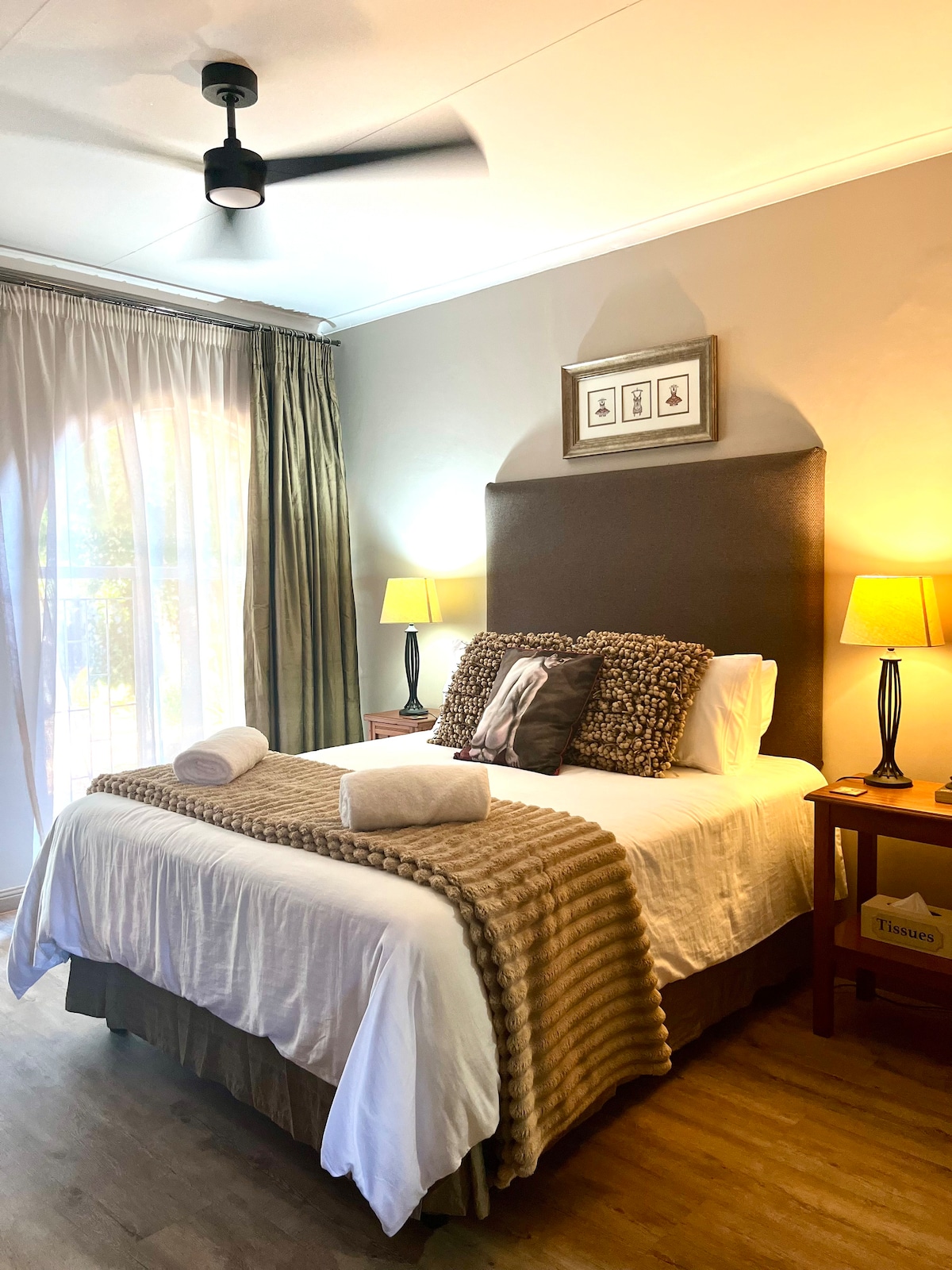1 spavaća soba, (bračni krevet), dva kreveta za jednu osobu u dnevnoj sobi i kuhinji. Privatan ulaz i privatna bašta. Kupatilo sa tušem i kadom. Obezbijeđeni su peškiri i rezervna ćebad. Kuhinja je opremljena priborom za samostalan boravak, šporetom, frižiderom sa zamrzivačem, mašinom za pranje veša, mikrotalasnom rernom i stanicom za kafu. Dostupan je TV sa Netflix-om i besplatnim Wi-Fi mrežom. Pristup zajedničkom bazenu i području braaija. Ograđeni parking sa sigurnosnim kamerama. Nalazi se u blizini tržnog centra, bolnica, škola, stadiona i rezervata prirode.