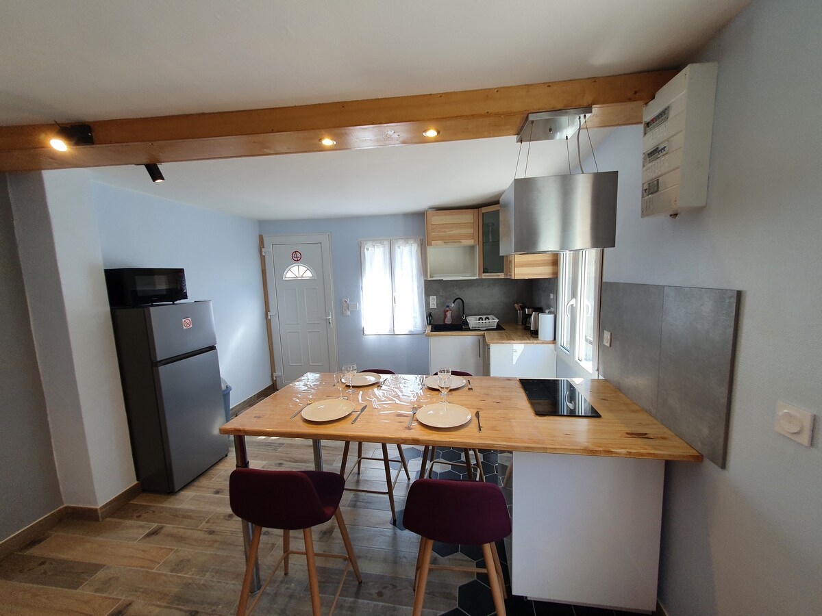 Nous vous proposons un T2 de 39m2 avec une grande pièce de vie, une chambre, une cuisine équipée et une salle d’eau. Pour les couchages nous avons un lit de 140x190 dans une chambre indépendante et un canapé-lit de 140x190 dans la pièce de vie. Possibilité de fournir un lit bébé sur demande. Mise à disposition du jardin. Idéal pour 4 personnes maximum. ACCES INDEPENDANT AVEC ARRIVEE AUTONOME.