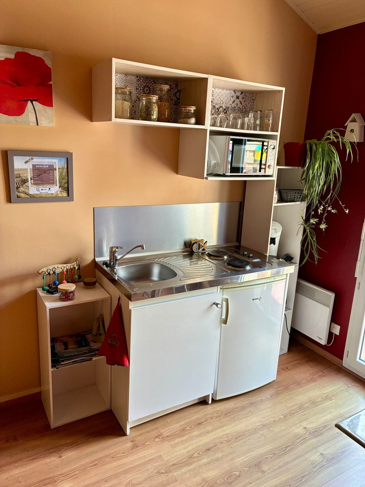 1 uređena kuhinja 1 dnevna soba - clic clac pr 2 pers 1,30/1,90 1 krevet za 1 osobu 90/190 1 mezanin za 2 osobe 1,40/2,00 kupatilo – oprema za tuširanje u WC-u samostalna soba sa 1 krevetom malo dvorište 10m 150 m od plaže 150 m od centra grada rerna – mikrotalasna – šporet na plin frižider TV 1 roštilj 1 stolica za bebe 1 kišobran posteljina nije uključena Wi-Fi je uključen sedmično iznajmljivanje Cene za H S 350 EUR PS – jul avgust 500E Detektor dima