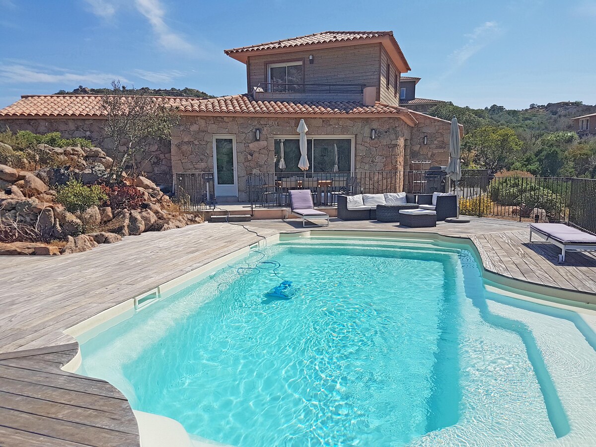 Kuća u Palombadži, 2 spavaće sobe, 2 kupatila, vrhunski panoramski pogled na more i bazen koji se greje solarnim kolektorima, sa prelivom, eventualno se deli sa 4 do 6 drugih osoba. Kuća je ocenjena sa 4 zvezdice. Na šumovitom zemljištu od 5000 m2 sa 2 kuće u pravom seoskom ambijentu. Panoramski pogled na more i obalu Sardinije. Idealno je smeštena, na 700 m od plaža Palombaggia, Folaca i Acciaghju. Restorani su na 700 m. Supermarket je na 7 km. Centar grada je udaljen 9 km.
