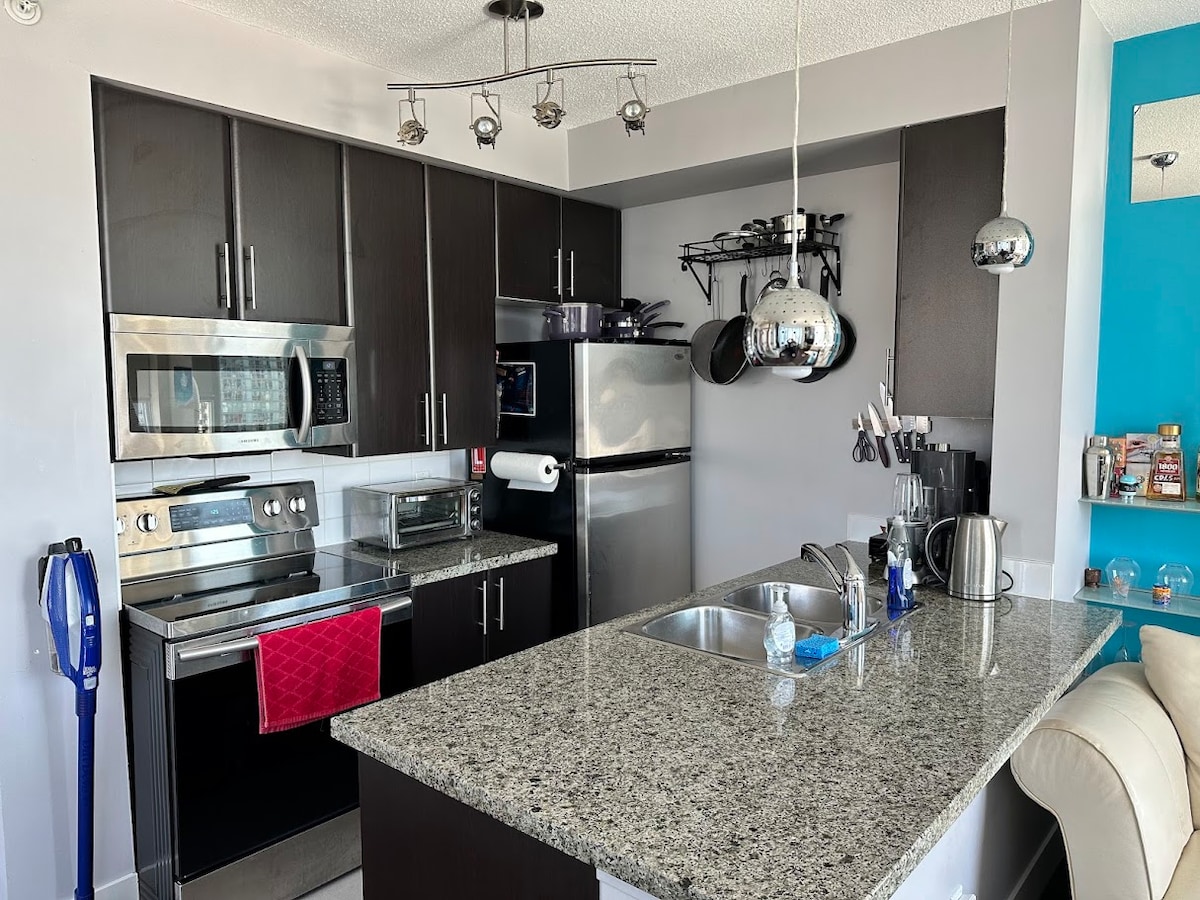 Pripremite se za odmor iz snova u ovom novom udobnom kondominiju! •Bračni krevet u spavaćoj sobi - prostrani ormar i nevjerovatan pogled iz svake sobe! •Kauč na razvlačenje za dvoje u dnevnoj sobi i kompatibilan sa pametnim televizorom •Besplatan podzemni parking za 1 osobu •Kupatilo s WC-om. Obezbijeđene su osnovne toaletne potrepštine radi lakšeg snalaženja •Potpuno opremljena kuhinja, nespresso aparat i neograničen broj mahuna •Blizina nebeskog voza, oko 10 minuta hoda •Odmah pored Lougheed Centra - velikog tržnog centra sa mnogo prodavnica i restorana!