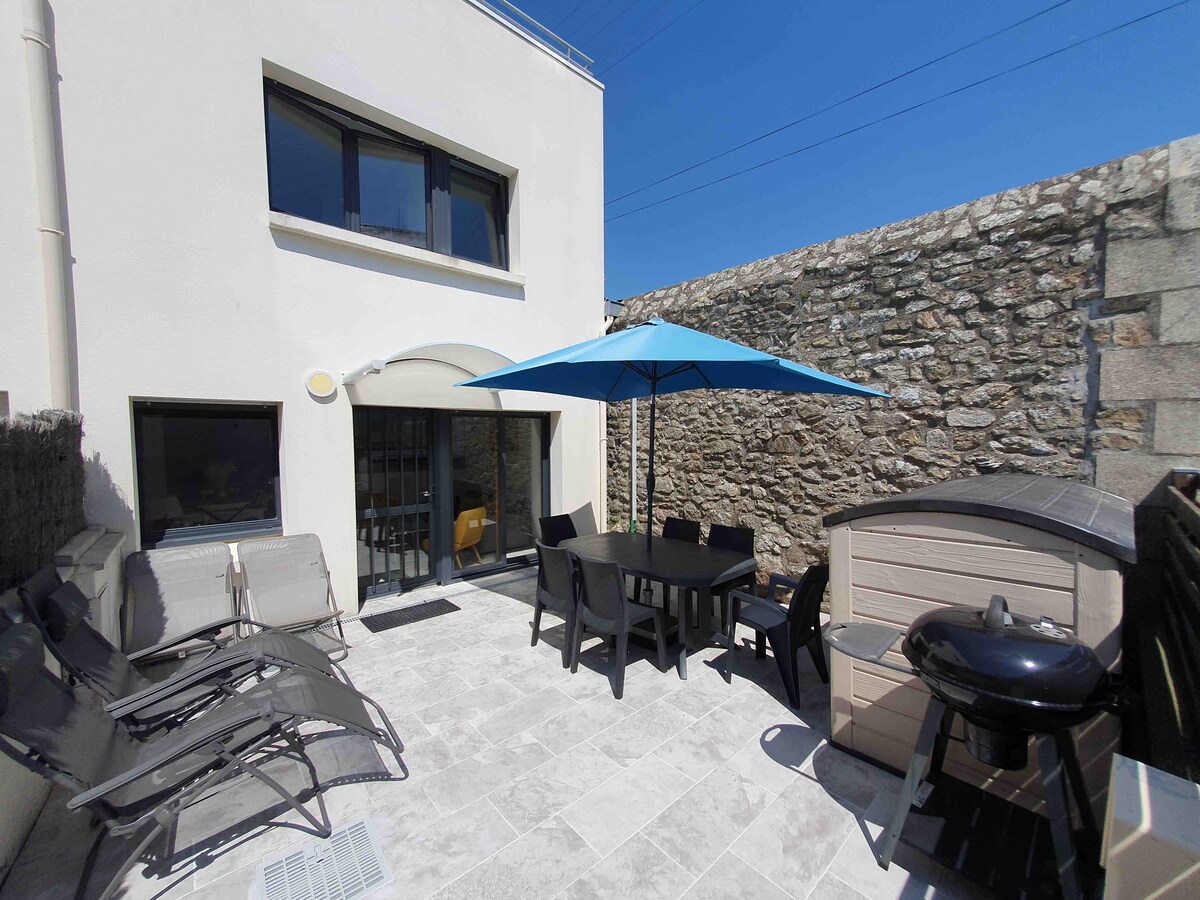 Jolie maison à Port Louis proche du port de plaisance et du cœur de la cité où vous pourrez vous y rendre facilement à pieds. - Pièce de vie spacieuse et lumineuse - Grande cuisine entièrement équipée - 1 salle de détente, 3 chambres avec des lits confortables (160x200), 3 salles de bains, 3 wc. Cette maison a tout pour vous plaire. Jardin entièrement clos avec - table à manger - transats et plancha gaz. Un garage est à votre disposition. Vous pouvez également vous garer dans la cour.