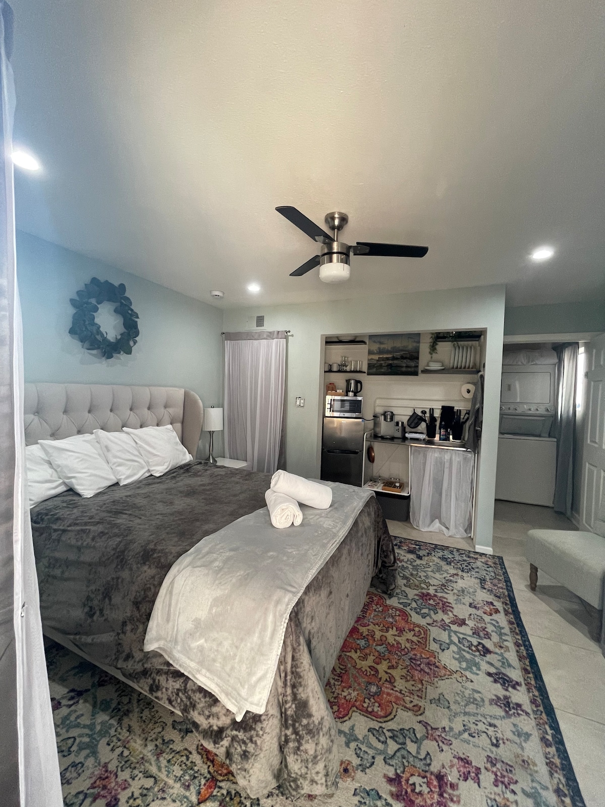 Uživajte u elegantnom dizajnu našeg studio prostora koji se nalazi u srcu LB-a. Sa udobnim bračnim krevetom, divnom čajnom kuhinjom sa besplatnom kafom i čajem, kupatilom i namještajem od ružinog drveta koji nudi opuštajući i topao doživljaj. Naša jedinica je pješke udaljena od najboljih restorana, atrakcija, kao što su obalno selo, akvarijum, istorijska avenija Pajn i Kongresni centar. Takođe se nalazi u blizini metroa i okeanskog fronta, što je savršeno za goste koji putuju bez automobila.