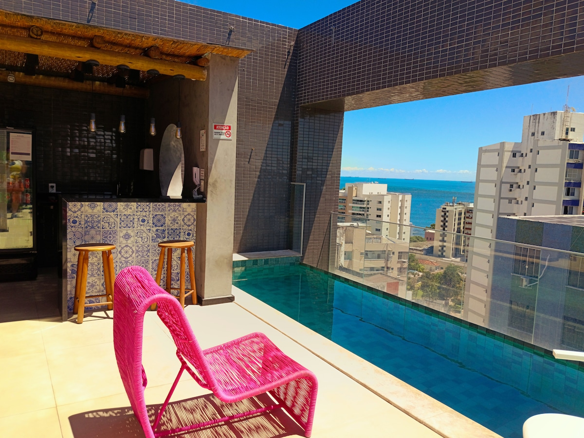Moderan apartman sa dva kupatila u sklopu sobe i pogledom na okean koji oduzima dah iz svake sobe, pažljivo uređen da pruži udobnost i eleganciju na vrhunskoj lokaciji u Bari, jednoj od najpoželjnijih četvrti u Salvadoru. Samo 30 metara od plaže, nalazi se na karnevalskoj stazi, a oko 100 metara od svetionika Farol da Barra! Ovde sve možete da obavite pešice: plaže, kafiće, restorane, pijace, apoteke i kupovinu.