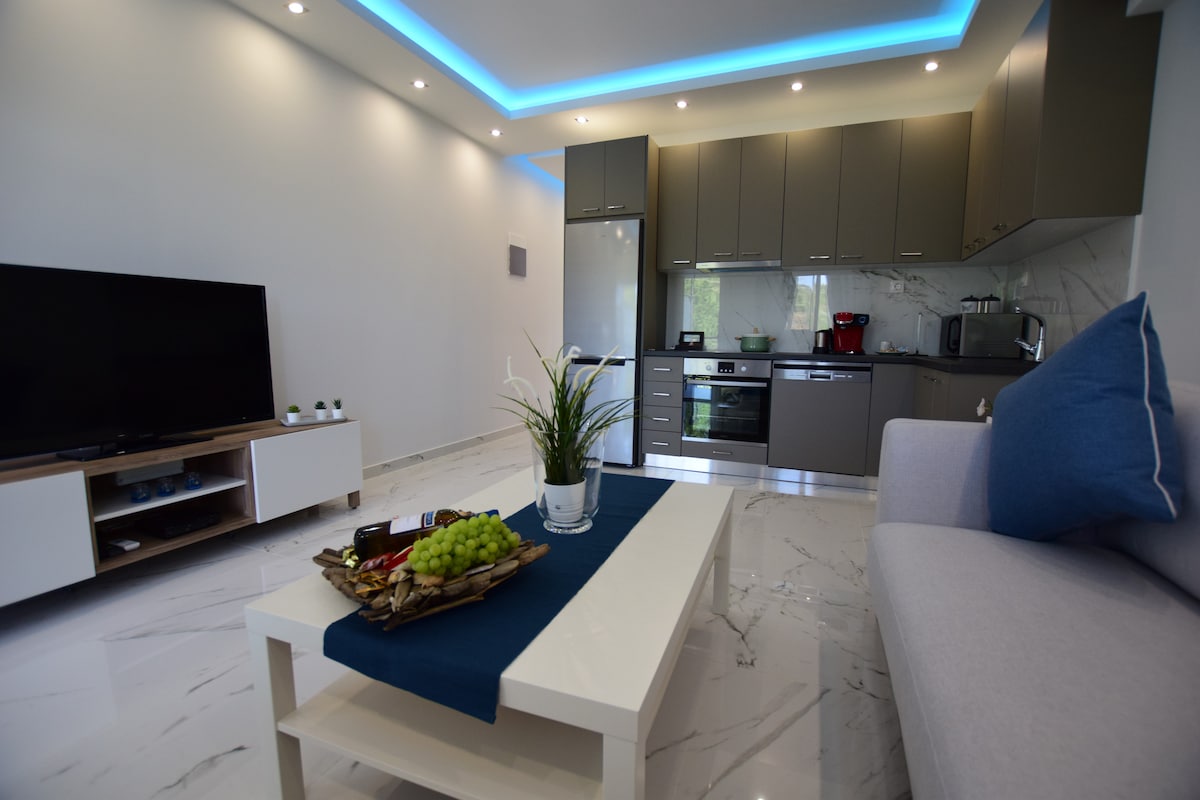 Uživajte u elegantnom doživljaju u ovom centralnom području,samo 30 m od centralnog trga u selu, ali i od plaže sa mnogim kafanama, barovima na plaži, kafićima, prodavnicama, koji su vam na raspolaganju 7 dana u sedmici. Krevet je dvostruki, a dušek ima memorijsku pjenu za udoban i miran san. Kuhinja je velika i potpuno opremljena. Kupatilo je prostrano i moderno. S balkona se pruža pogled na Sarti i planinu Dragoudeli.