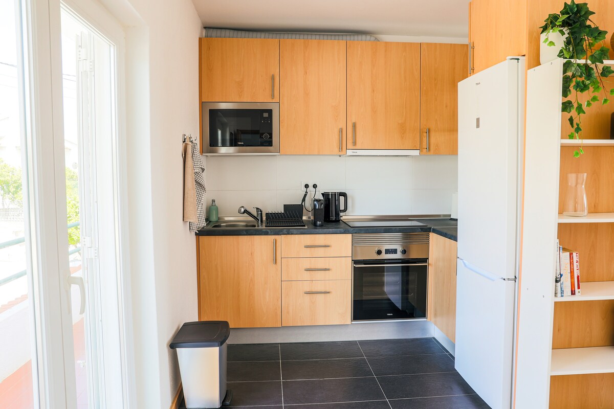 Dođite da se opustite sa celom porodicom u nedavno renoviranom stanu sa pogledom na okean. Ovaj stan na 1. spratu nalazi se u mirnom delu grada „Pera de Baixo“ i do njega se dolazi kroz zaseban ulaz. Uživajte u prelepim plažama Kosta da Kaparice u roku od 5 minuta i centru Lisabona u roku od 20 minuta. Stan je u potpunosti opremljen, ima brz WI-FI i aktivan Netflix nalog. Ima 2 bračna kreveta koji se mogu razdvojiti na 2 kreveta za jednu osobu, kao i krevetac za bebu.