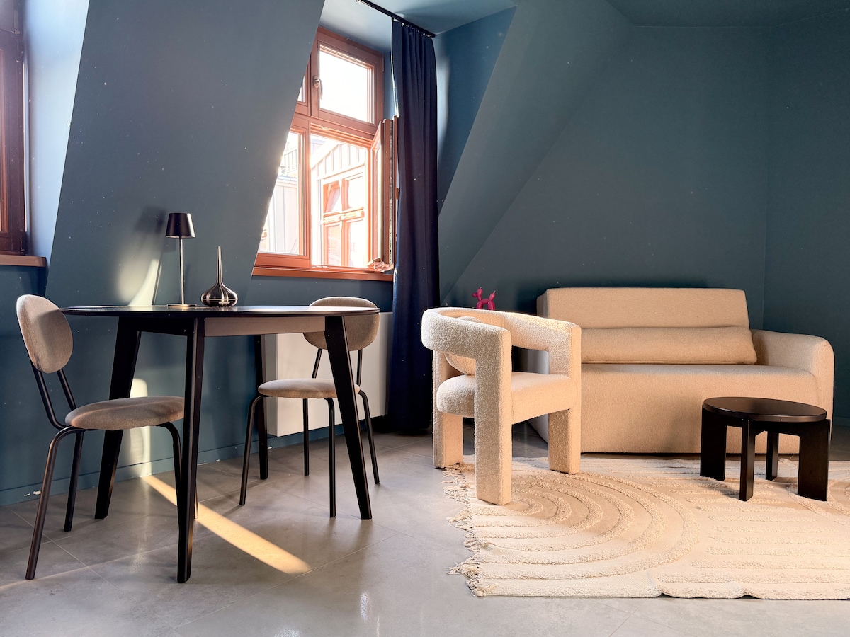Udoban stan na trgu Kolegic, ističe se dodatnim mjestom za spavanje zahvaljujući mezaninu. Unutrašnjost je topla, ima mesto za rad. Najveća prednost stana je odlična lokacija u blizini Starog pijačnog trga.
