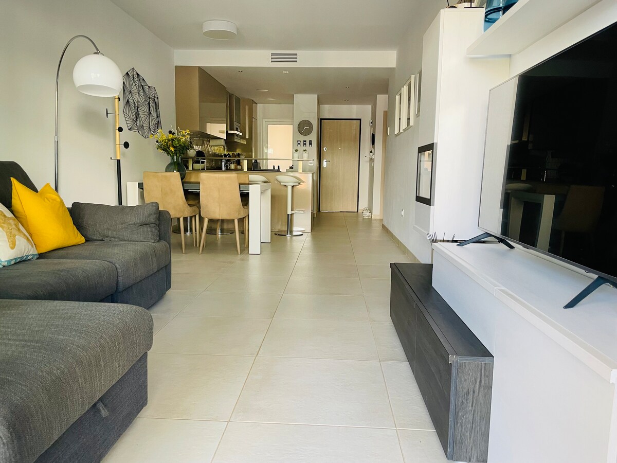 Opustite se u ovom mirnom, elegantnom prostoru u prelepom, dobro održavanom kompleksu Mar de Pulpi. Ovaj moderan stan na prvom spratu ima sve što vam treba za opuštajući i udoban boravak. Besplatan Wi-Fi, udoban krevet, kauč na razvlačenje, 2 televizora sa ravnim ekranom, potpuno opremljena kuhinja sa mnogim dodatnim sadržajima kao što su veliki frižider-zamrzivač, mikrotalasna peć, filter aparat za kafu, veš mašina, odeća za jelo, pegla, fen za kosu. 5 minuta lagane šetnje do plaže, restorana i supermarketa.