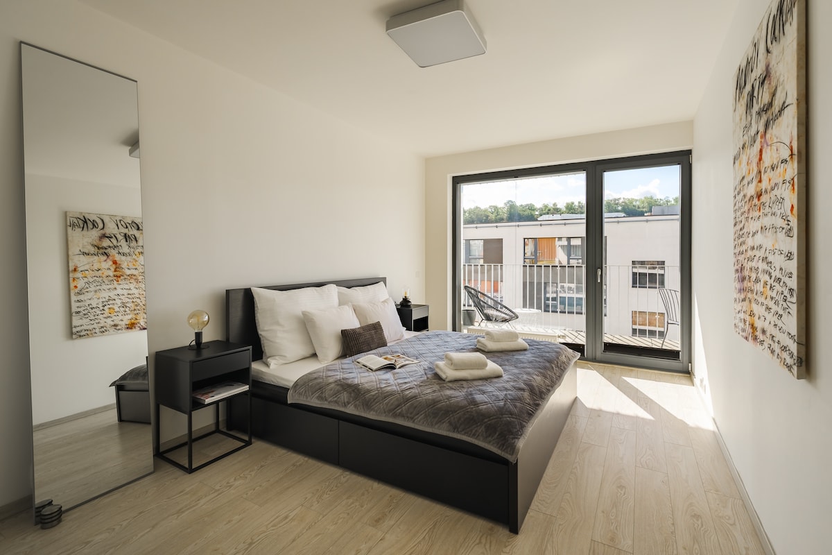 Novi moderni stan, nalazi se u tihom delu Praga u neposrednoj blizini parka u neposrednoj blizini parka i istovremeno je udaljen samo 15 minuta od centra Praga. Pogodan je za 2 osobe koje traže gužvu i vrevu grada, a istovremeno nakon napornog dana žele da uživaju u prijatnoj večeri sa sedenjem na privatnoj terasi od 30 m2, ispod pergole u sopstvenom hidromasažnoj vodi tokom cele godine ili da se opuste u prostranoj privatnoj sauni. Da bi romantika bila prijatnija, samo uključite električni kamin. Besplatan parking. u zajedničkoj garaži.