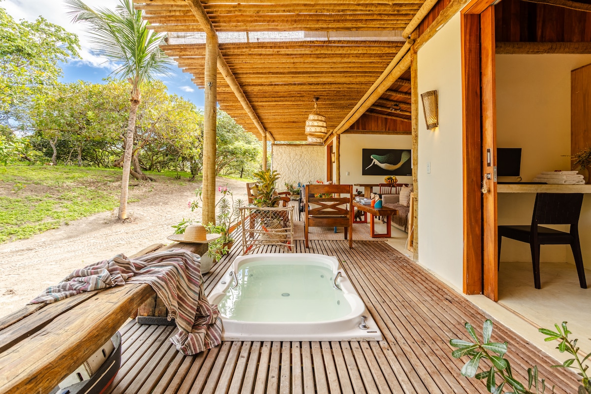 2 minute hoda od najljepše plaže u Jericoacoari, na plaži Malhada. Privilegovano i rezervisano mjesto. Sa širokim pogledom i blizu centra. Espaço je miran, udoban i visok astralni, sa prijatnim spoljnim prostorom okruženim velikim, lisnatim vrtom sa mnogim autohtonim biljkama i drvećem. Ima terasu/vidikovac sa pogledom na Nacionalni park od 360°, koji takođe gleda na more i dine. Savršeno za ljubitelje prirode
