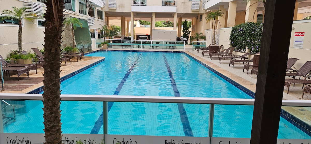 Modern and cozy apartment located in Residencial Sunny Flats, approximately 400 meters from Bombas beach in Bombinhas. It has a beautiful outdoor area with a swimming pool on the terrace, gourmet area, fire pit, games room, and kids' area. It has an integrated living room and kitchen with a dining table, a guest bathroom, 1 air-conditioned bedroom, a sofa bed in the living room, and a balcony with a private barbecue.
