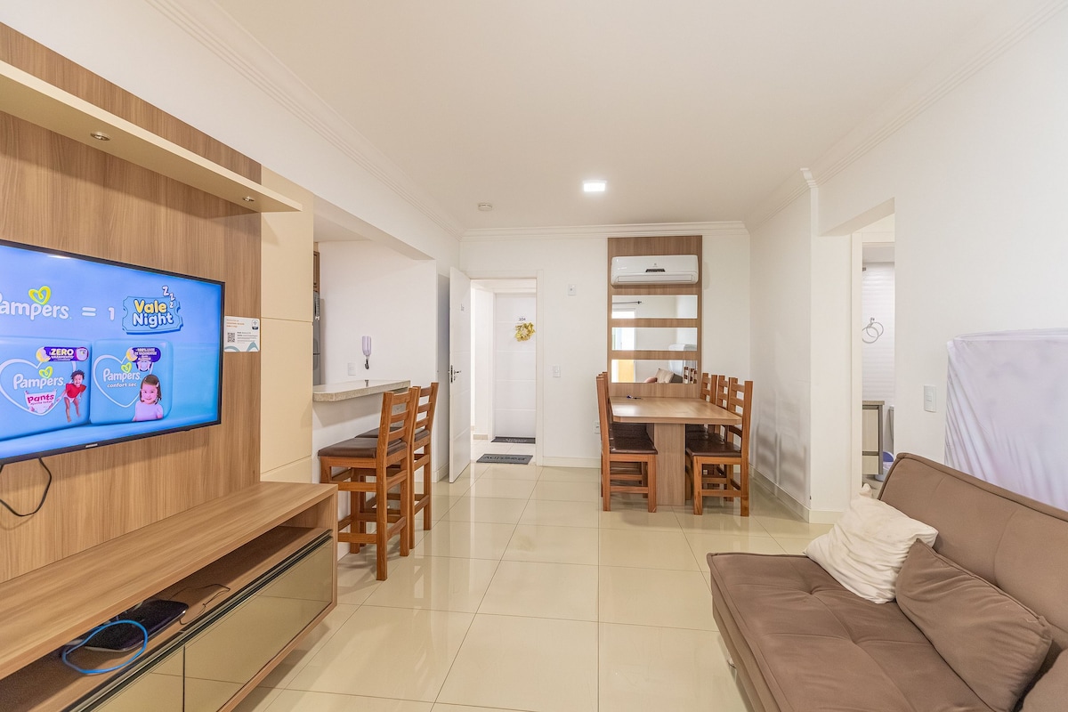 Modern and cozy apartment located in Residencial Sunny Flats, approximately 400 meters from Bombas beach in Bombinhas. It has a beautiful outdoor area with a swimming pool on the terrace, gourmet area, fire pit, games room, and kids' area. It has an integrated living room and kitchen with a dining table, a guest bathroom, 1 air-conditioned bedroom, a sofa bed in the living room, and a balcony with a private barbecue.