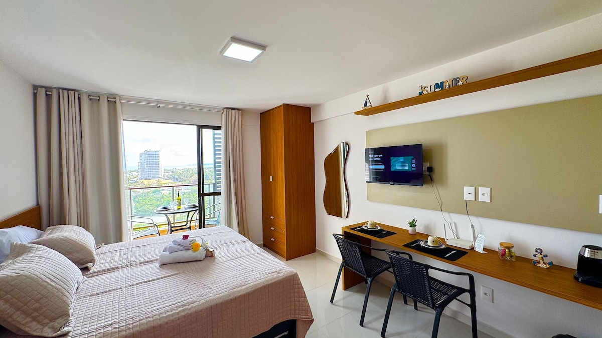 Stan sa pogledom na more u stanu odmah pored plaže. Idealno za opuštanje sa prijateljima, porodicom ili sami. Spavaća soba sa klima-uređajem; Široko kupatilo; Sofa i trpezarijski sto u dnevnoj sobi; Provetreni balkon; integrisana kuhinja sa mikserom, posuđem i posuđem. Wi-Fi je dostupan (internet vlakna 30 mega) - Odlično za kućne radnike. Najbolja lokacija u Vilasu: Pored plaže, 8 km od aerodroma SSA i 5 km od centra Lauro de Freitas.