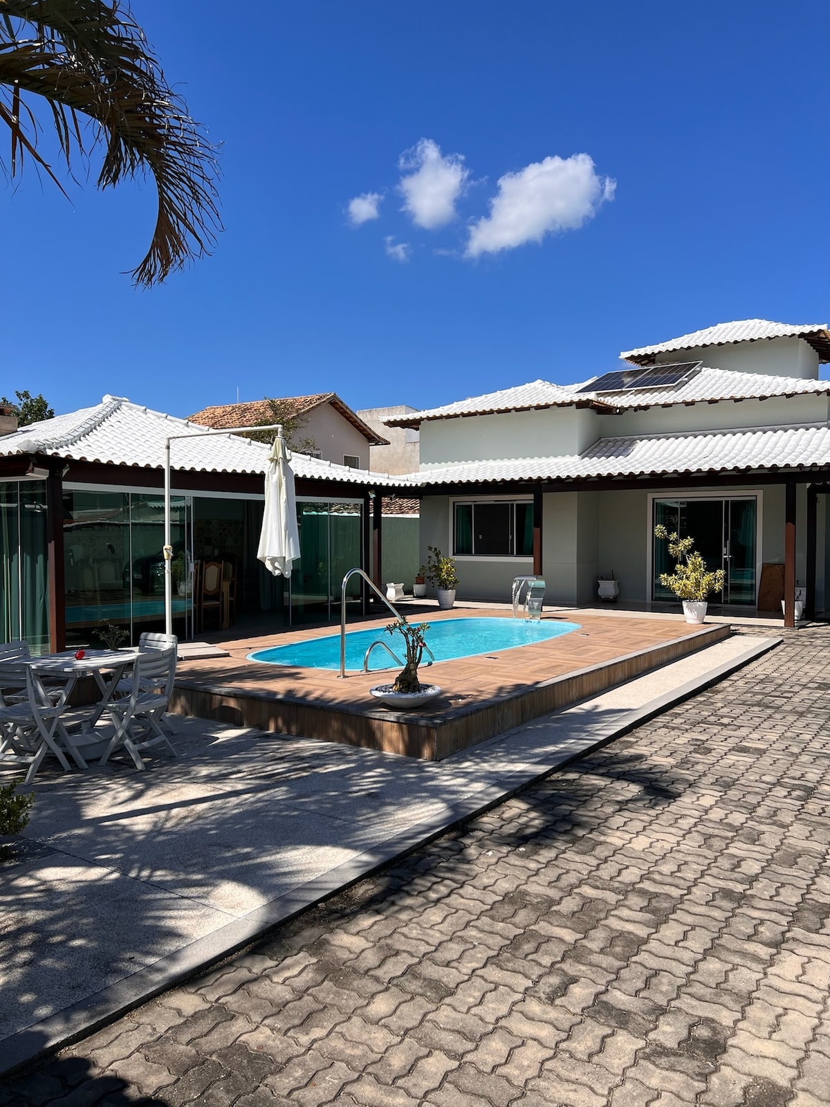 Predivna kuća u mirnoj ulici, sa dvije spavaće sobe, apartmanom, obje sa klima-uređajem, super dobro sastavljena, sa opremljenim dnevnim boravkom i kuhinjom, kupatilom za druženje i još jednom u prostoru za slobodno vrijeme, sa roštiljem, bazenom sa prelijepom terasom i parking mjestom za 4 vozila 100 metara od najbolje plaže u Itaúni u Saquaremi. Internet brzinom od 240 MB